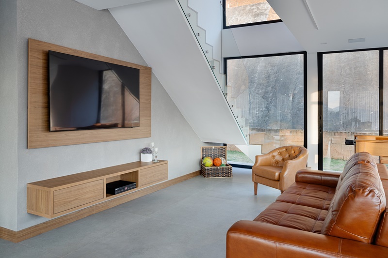 “Como não achamos disponível no mercado um revestimento cimentício da forma que especificamos, a nossa solução foi criar esse revestimento na própria obra. Fizemos formas de madeira, fizemos o concreto e aplicamos na parede, criando um resultado mais natural e com um revestimento proporcional ao tamanho da casa”.