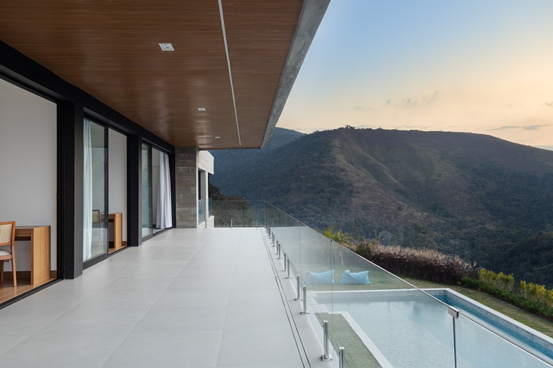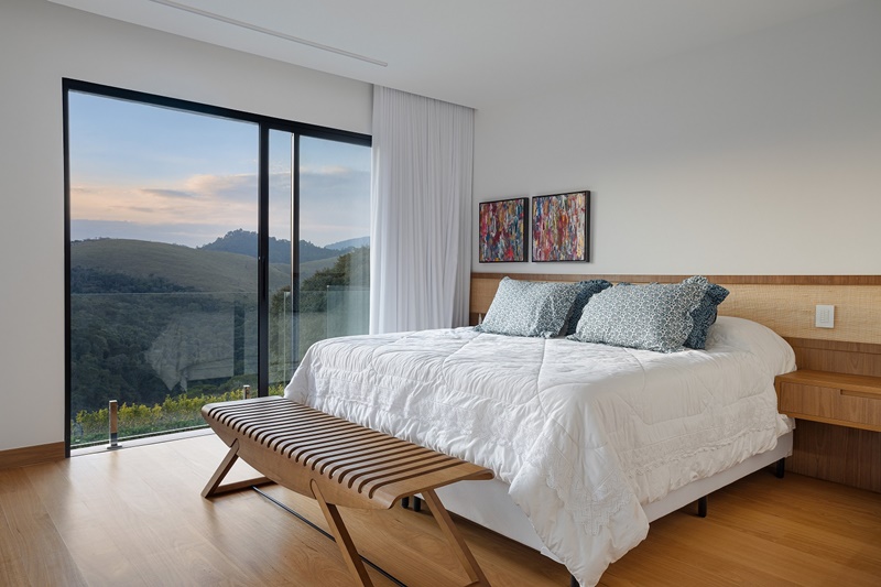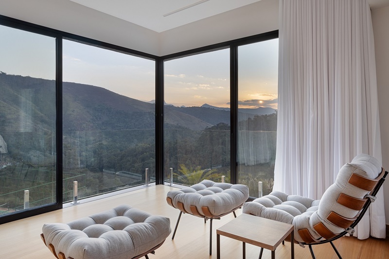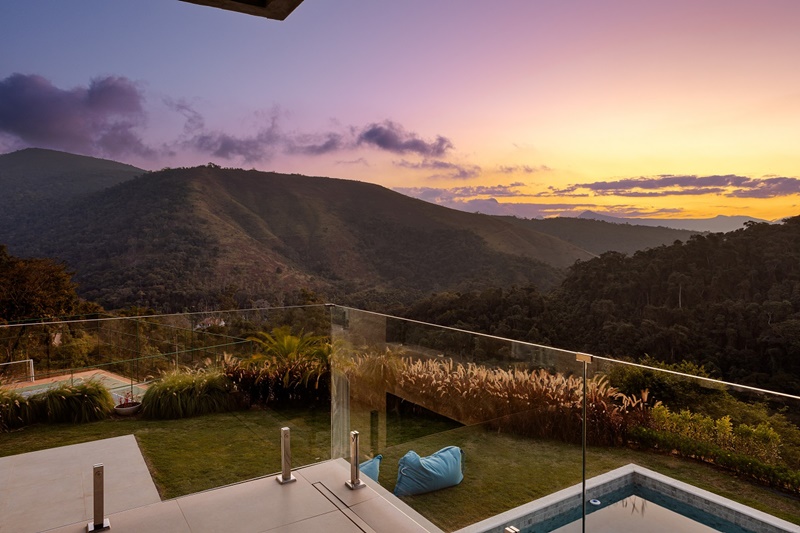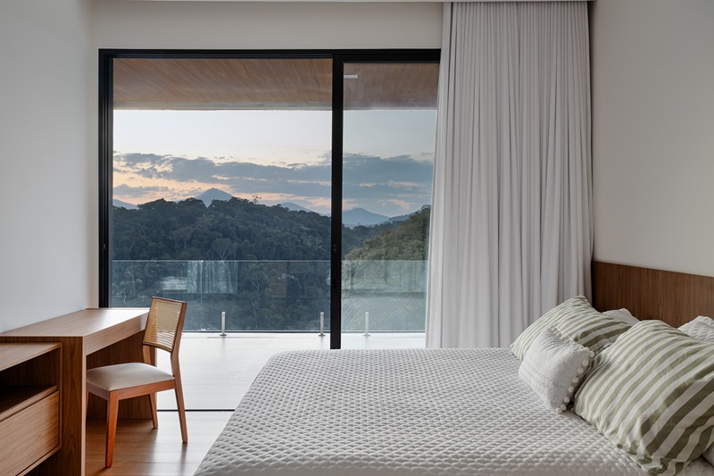 Todos os três quartos dão numa varanda acima da área social e compõem a arquitetura da fachada; já a master tem a vista para dois lados, frente e lateral da casa, com uma vista privilegiada pro vale, contemplando todo o verde da serra.