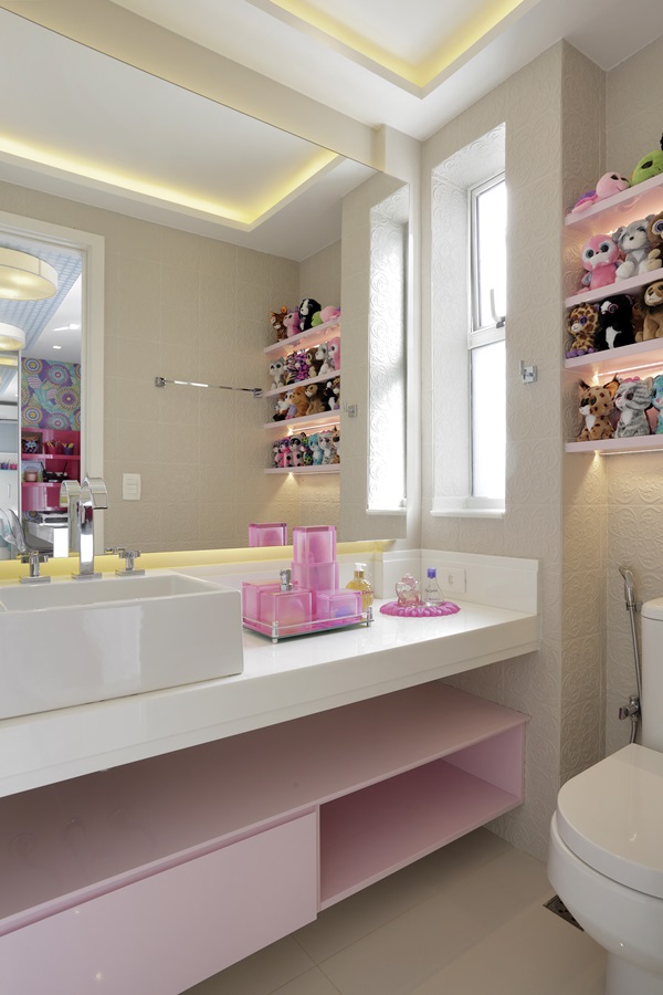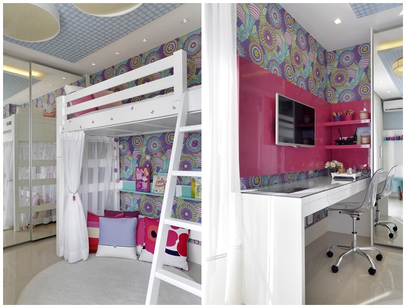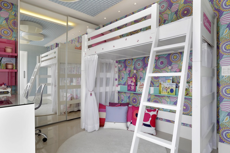 A suíte da filha, uma menina de 8 anos, é lúdica e colorida: o papel de parede estampado e a marcenaria em laca pink são os destaques do cômodo, bem como a cama tipo beliche – a parte de baixo é um espaço vago, que pode ser transformado em cabaninha de brincadeiras ao fechar a cortina adaptada.