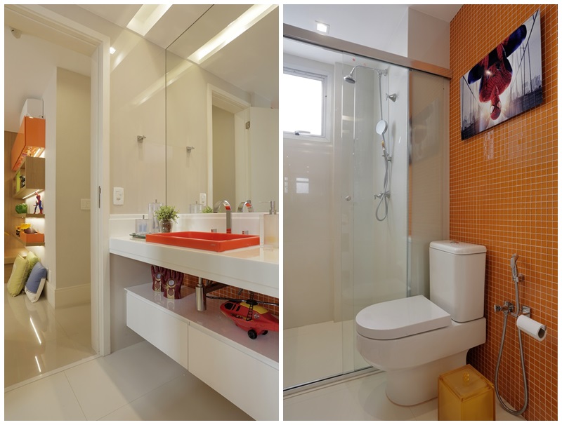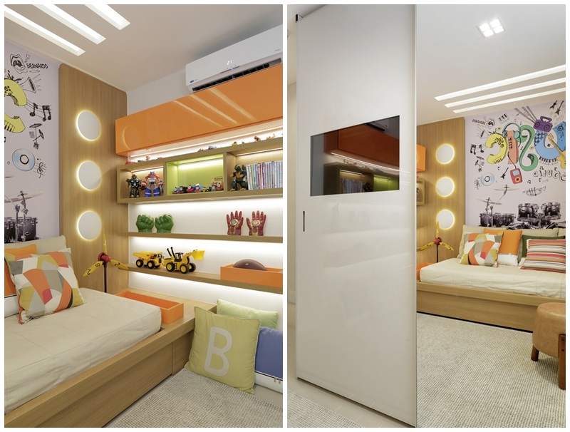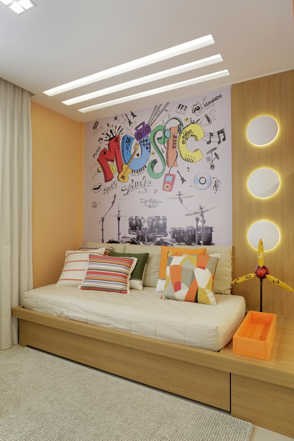 Para compor o quarto do filho mais velho do casal, Claudia e Patricia resolveram destacar os hobbies do garoto de 12 anos: um painel de parede traz a palavra “music” e a foto de uma bateria, além de desenhos que representam diversos símbolos musicais. Em uma das paredes, nichos iluminados dão destaque aos seus action figures e brinquedos de heróis favoritos.