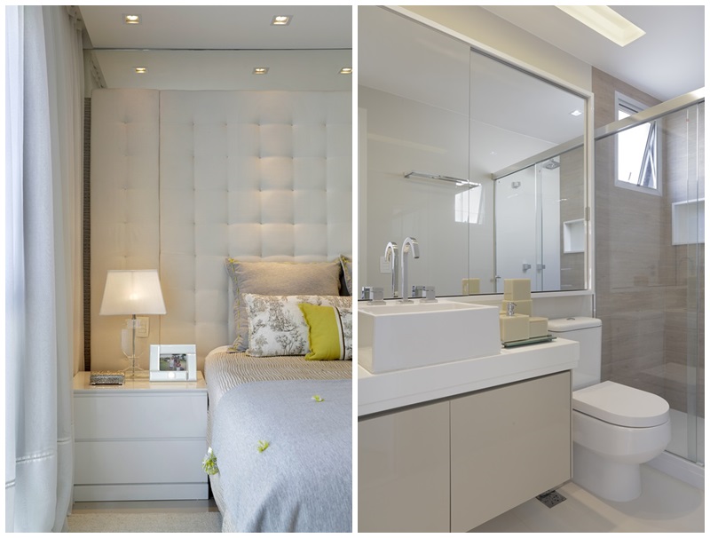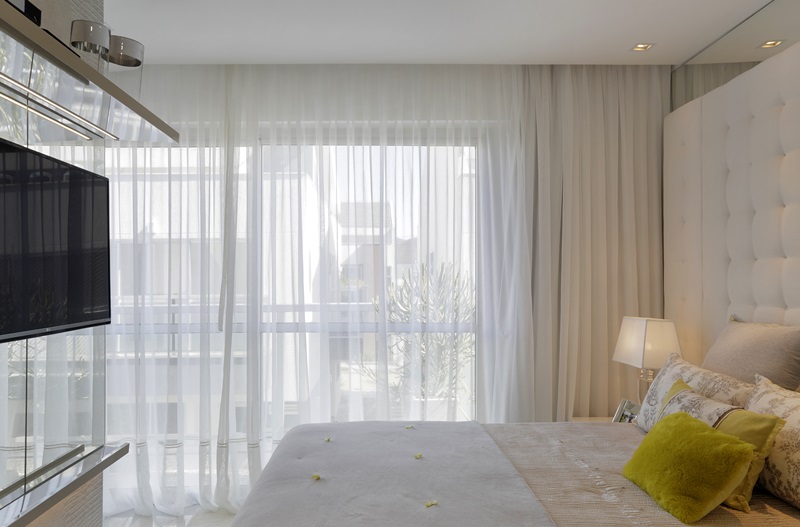 No segundo andar ficam os quartos da família: com 15m², incluindo o closet, a suíte do casal prima pelo uso do branco total, com cabeceira em capitonê estofada em linho, papel de parede com textura de couro e painel da TV espelhado.