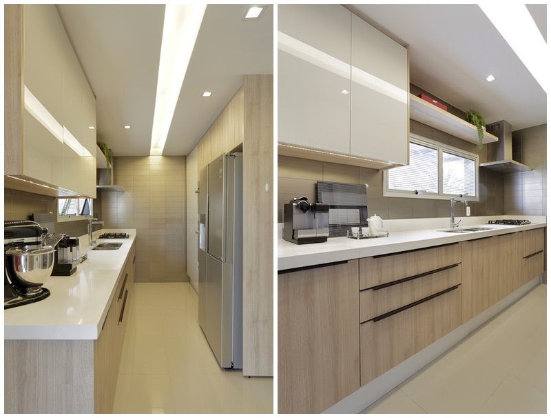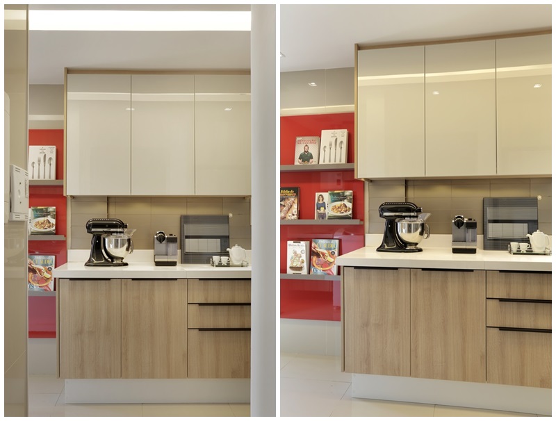 Na cozinha, um painel na cor vermelha destaca as prateleiras estreitas que acomodam os livros de receita, contrastando com a tonalidade neutra dos armários e revestimentos do ambiente.