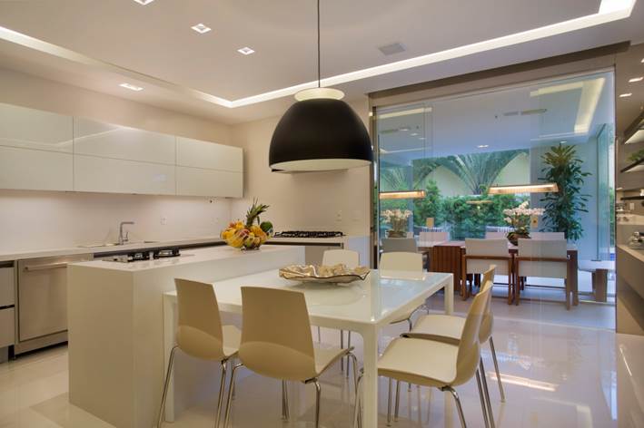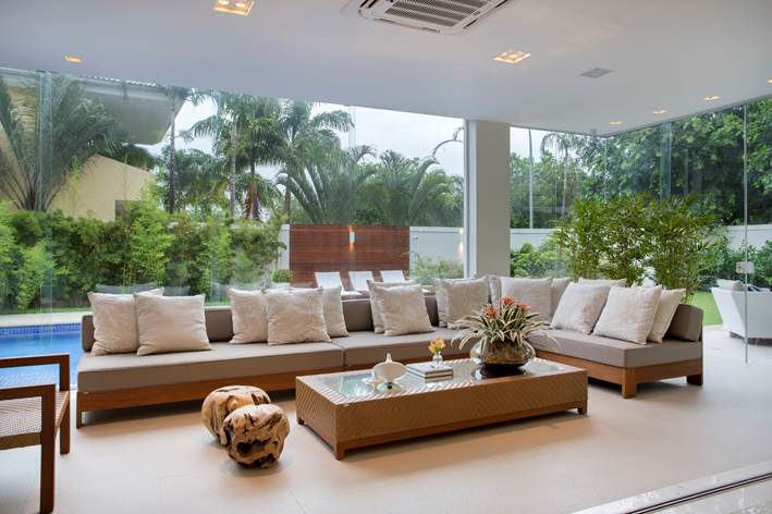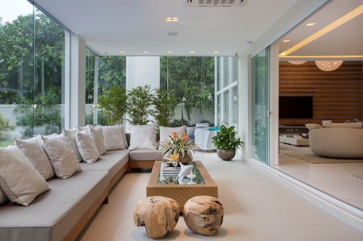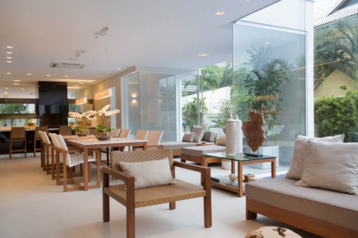 A varanda se integra tanto à área externa quanto à sala de estar e jantar através de panos de vidro, recolhidos para as laterais.