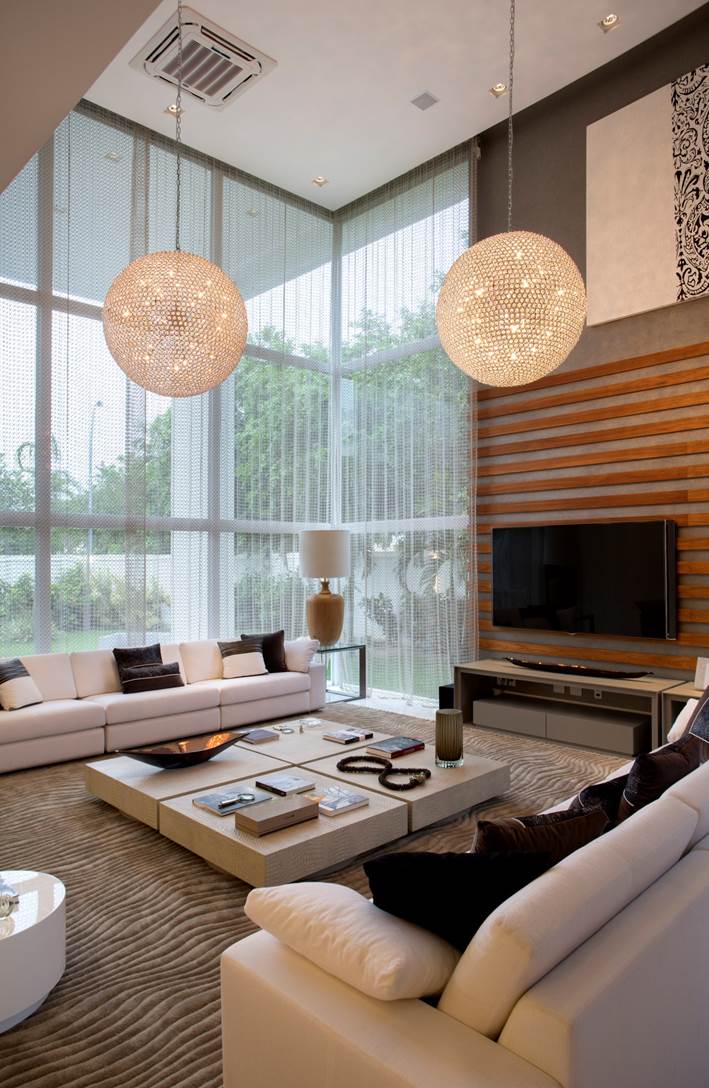 Áreal total sala de estar e jantar: 110m² · Cortinas: Tecido rendado da Artefacto e confecção da Orlean. · Luminárias pendentes: Allight. · Parede da TV: Ripas de freijó com papel de parede. Automação ligada na central, não precisando de equipamentos no local. · Tapete: Santa Mônica. · Móveis: Artefacto · Abajures de madeira: Sierra.