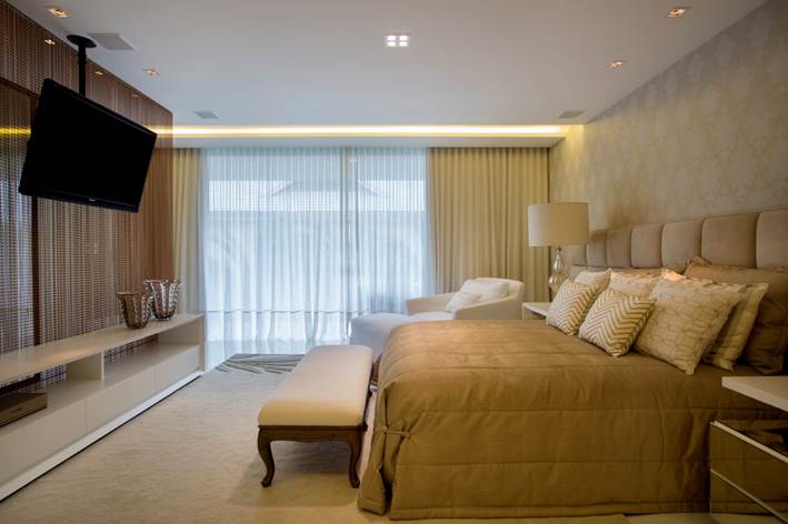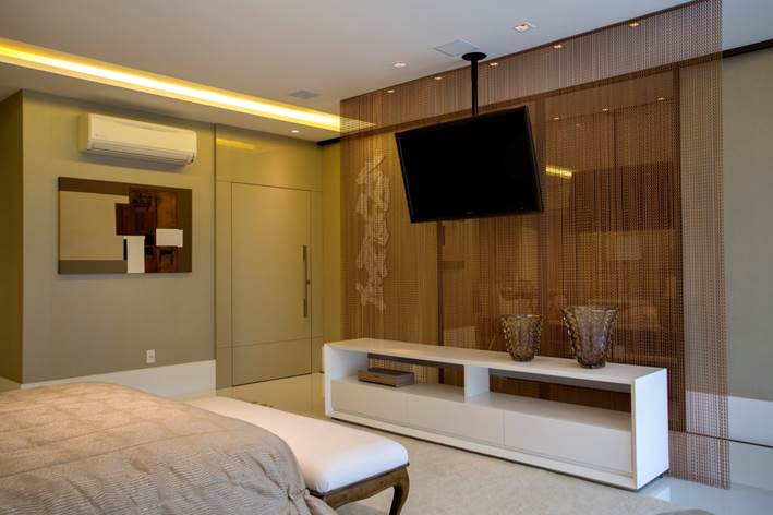 Automação ligada na central, não precisando de equipamentos no local. · Tapete: Santa Mônica. · Móveis: Artefacto · Abajures de madeira: Sierra.