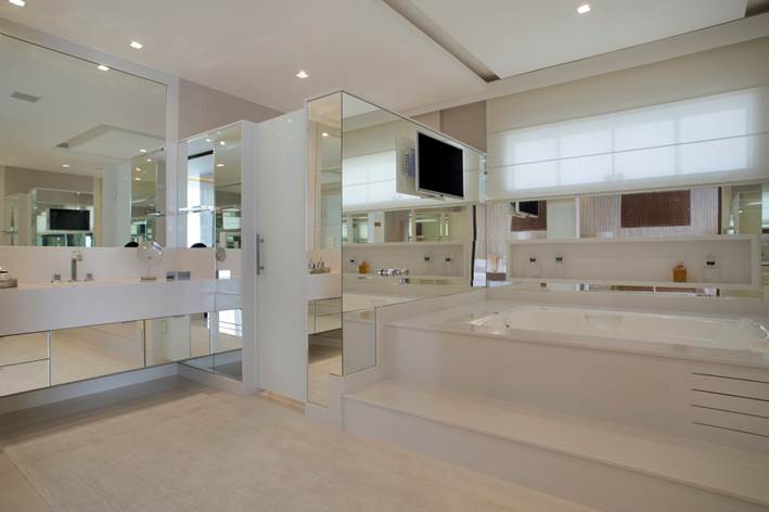 Área total: 24m² · Material do piso: Porcelanato · Marcenaria: Lacca · Material das bancadas e entorno da banheira: Nanoglass