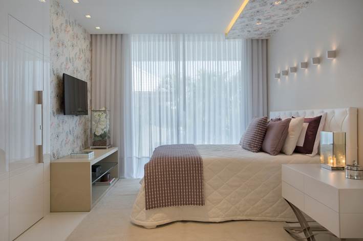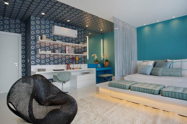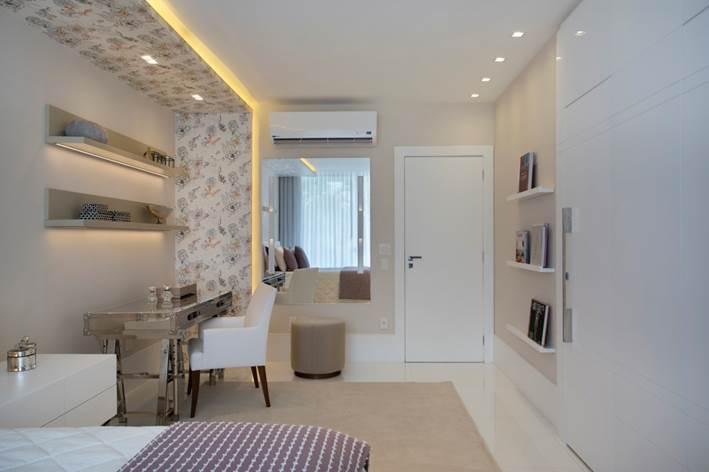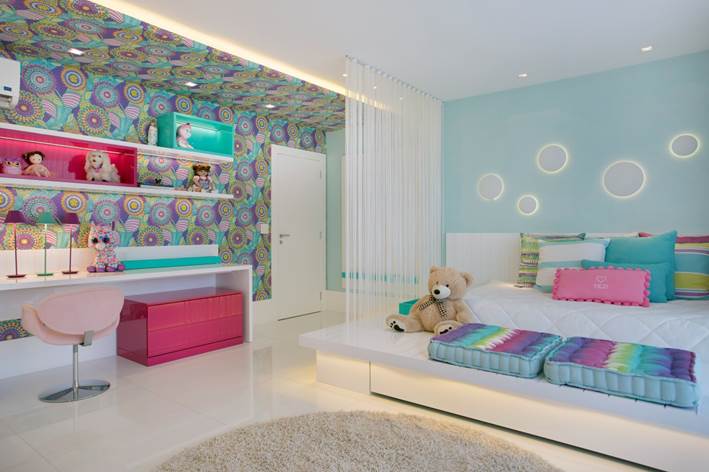 Quarto da filha de 11 anos – Área total do quarto: 40m² · Móveis: Artefacto. · Papel de parede: Orlean · Marcenaria: Lacca ·