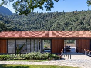 Casa de campo construída em Petrópolis mistura elementos tradicionais e contemporâneos. Com dois pavimentos, conta ainda com vista para o pico Maria Comprida, que integra o conjunto de elevações da Serra das Araras. [...]