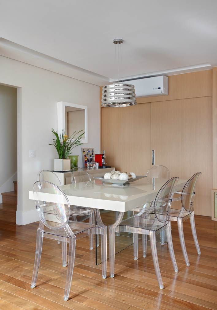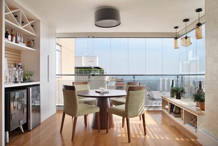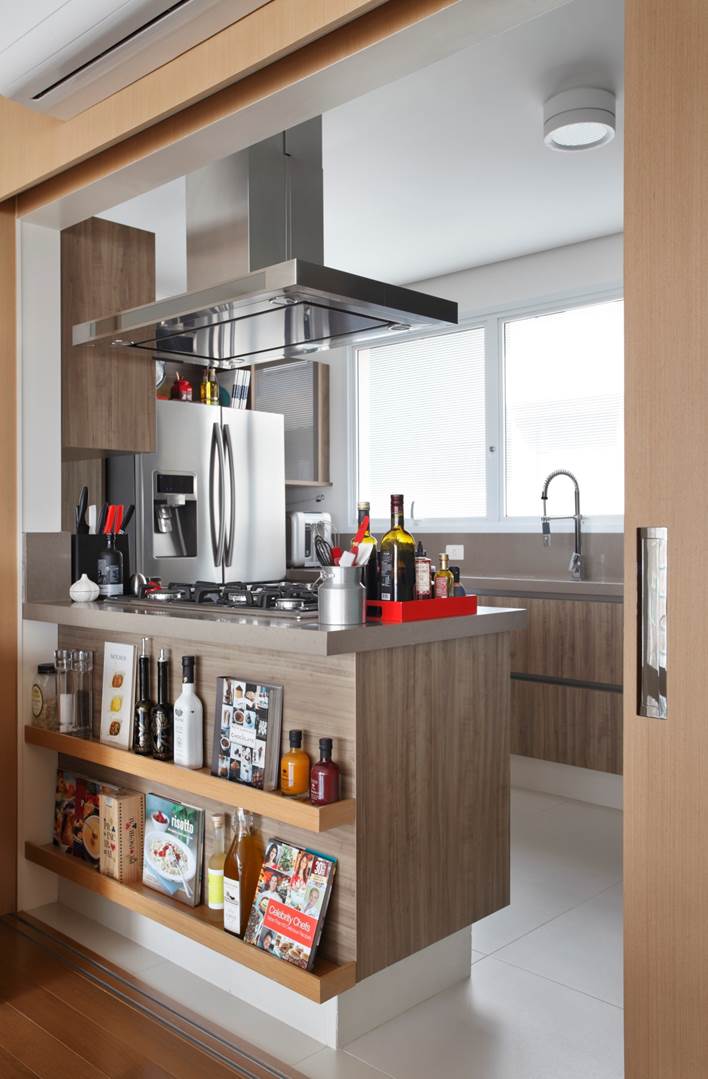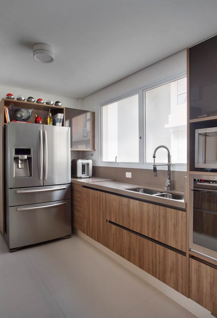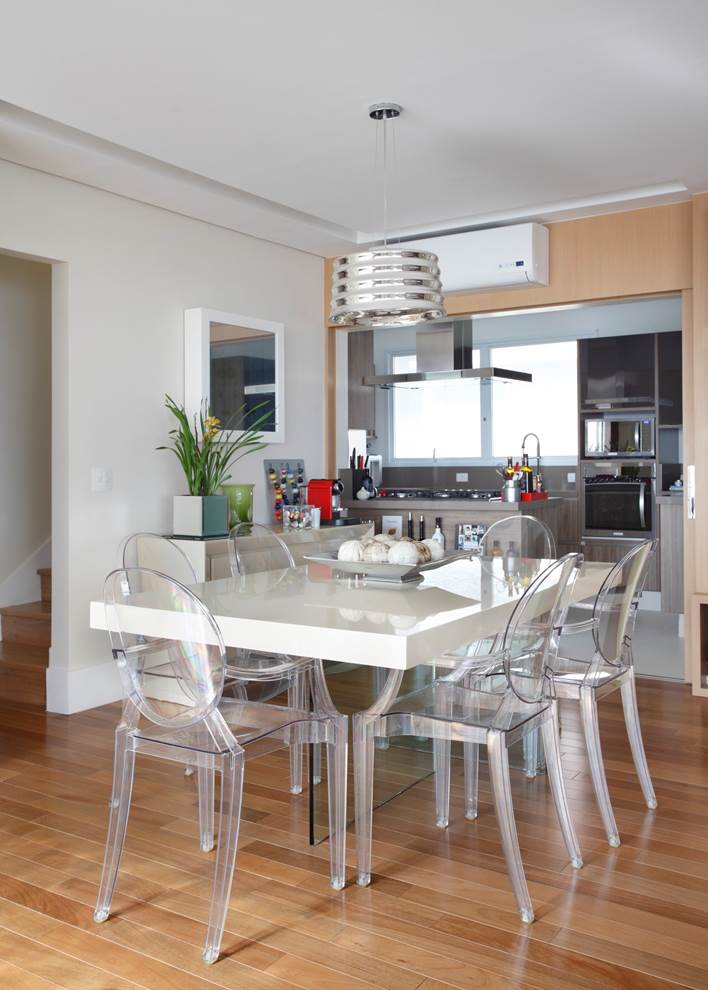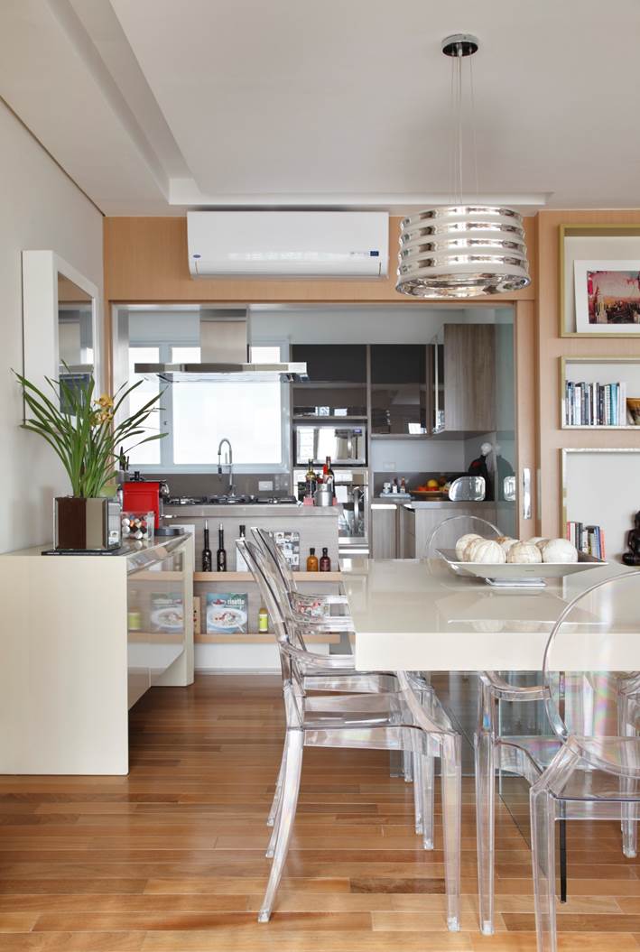 A cozinha foi aberta para a sala de jantar e a varanda incorporada ao living.