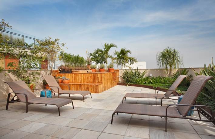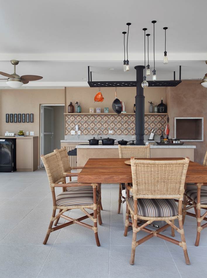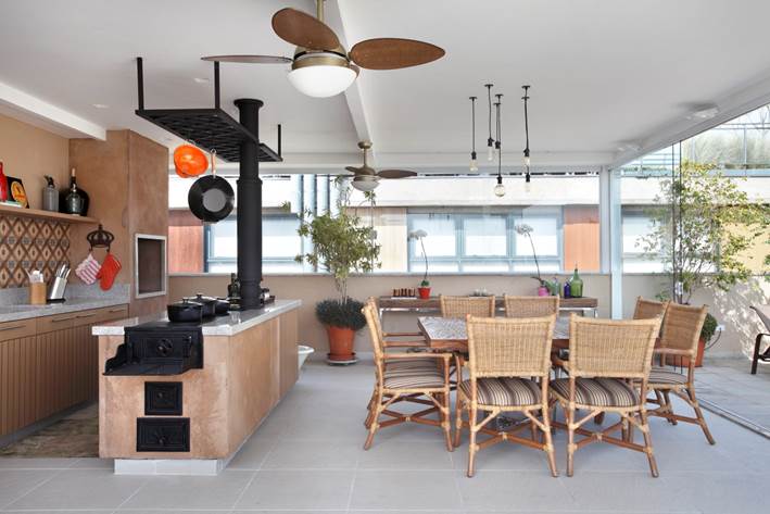 Mas o ponto alto desde projeto é, sem dúvida, a total repaginação da área externa, um espaço que antes parecia não ter função. “Quando o cliente comprou esta cobertura o andar superior parecia abandonado. Partimos praticamente do zero para criar ali espaços de lazer ao ar livre, com direito a banheira de ofurô, espreguiçadeiras, plantas e principalmente uma cozinha gourmet coberta, com fogão mineiro e panelas de barro”, conta Solange, explicando ainda que a culinária é um dos hobbies do casal.