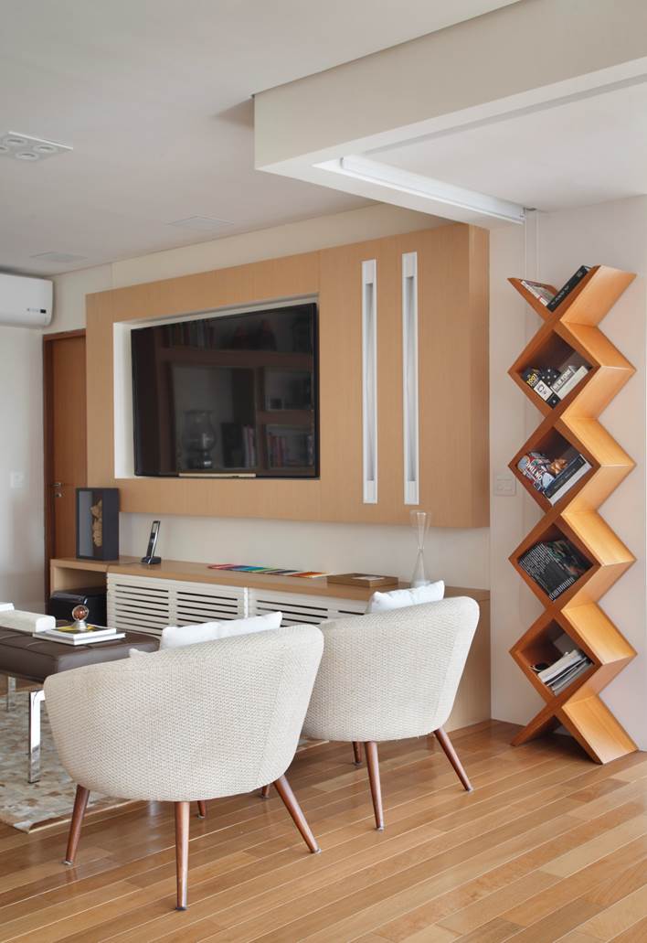 No home theater aparece embutida na marcenaria e também no teto rebaixado em gesso, de forma indireta, criando sutilmente a divisão dos espaços.