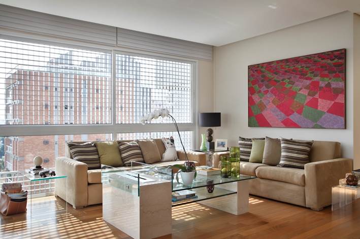 O projeto de decoração teve como desafio principal criar uma atmosfera aconchegante, mesmo em espaços amplos e banhados de luz natural, com esquadrias e vidros que vão do chão ao teto, ocupando boa parte das paredes nas áreas de convivência.