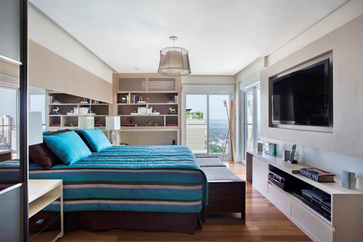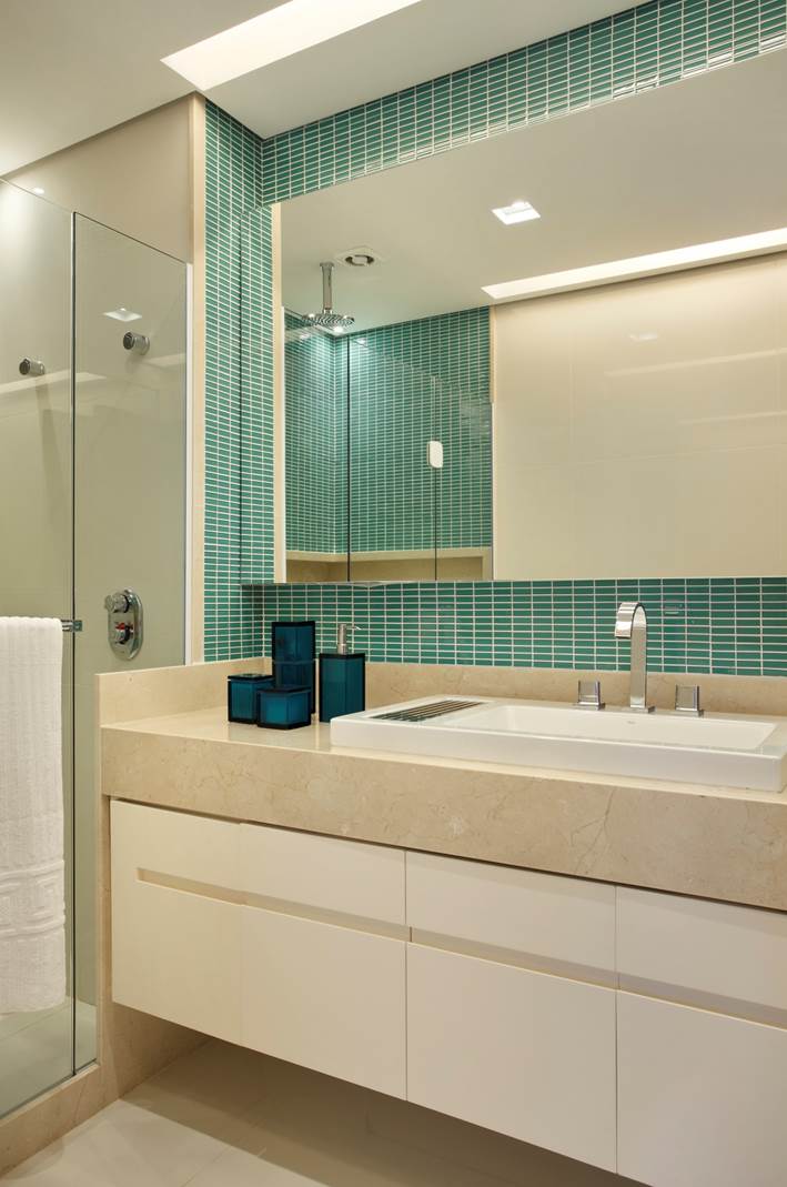 Um dos recursos utilizados por Solange Medina foi recorrer à marcenaria sob medida, tanto na área social como íntima. “Para combinar com os objetos e estofados que os moradores trouxeram da residência anterior, no living usamos o freijó linheiro e laca na cor verde. Já no quarto, o casal elegeu o tom aqua e a partir dele pesquisamos tecidos para as roupas de cama e pastilhas de revestimento para o banheiro” explica ela.