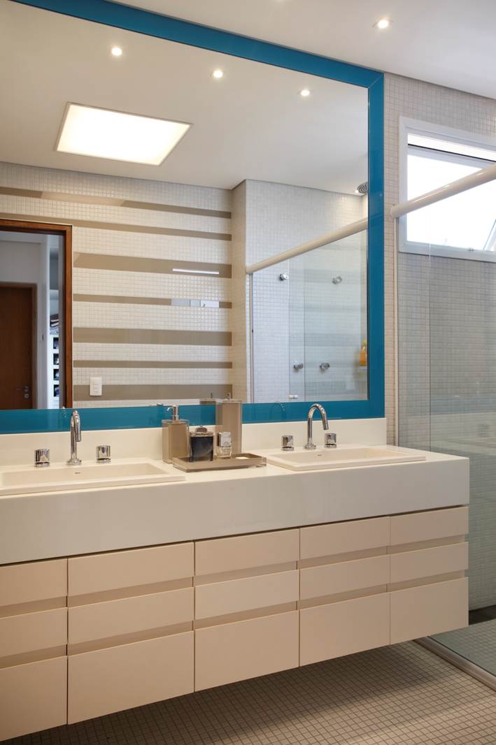Nos banheiros, a luz se une a espelhos para para dar a sensação de espaços mais amplos. Luminárias e abajures estrategicamente posicionados deixam os ambientes ainda mais acolhedores.