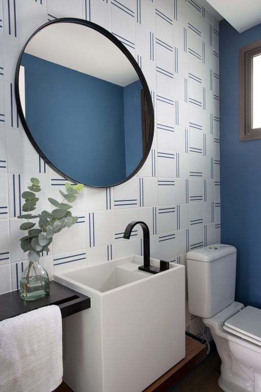 Outro destaque do projeto é a marcenaria da sala principal, desenhada pelos arquitetos, em especial a estante em freijó com espelhos, compondo o canto do bar, e, do outro lado, o móvel-rack sob a TV, com espaço para armazenar discos de vinil. Já no andar superior, a dupla destaca o jardim vertical e os azulejos com estampa geométrica usados na ilha do cooktop da área gourmet e na parede do lavabo. No quarto das filhas, roubam a cena as pinturas geométricas aplicadas nas paredes a partir de tintas comuns, da Suvinil.