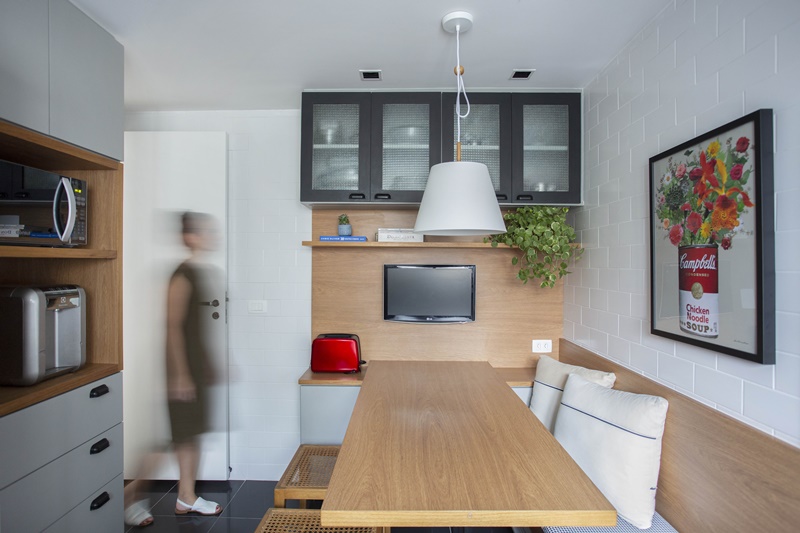 Entre as principais modificações na planta do imóvel, os arquitetos destacam a varanda, que foi integrada à sala e ganhou função de sala de jantar; o antigo quarto de serviço, que virou o closet do quarto do casal; a sala do segundo andar, que foi ampliada; e a área gourmet coberta, que foi construída. “Criamos três ambientes na área externa da cobertura. Uma área gourmet completa, com mesa, bancada e churrasqueira. Uma área de estar descoberta, que tem como pano de fundo o jardim vertical. E a área da piscina”, detalha Gustavo.