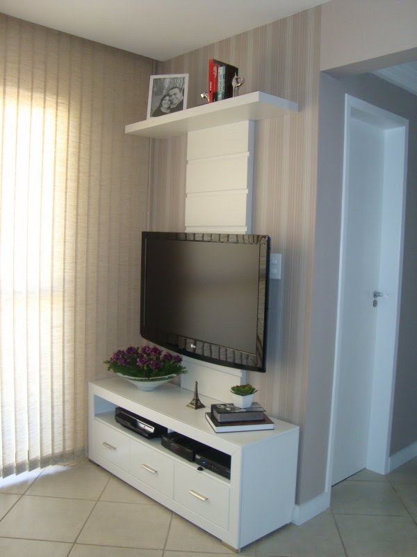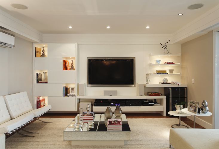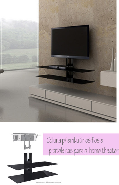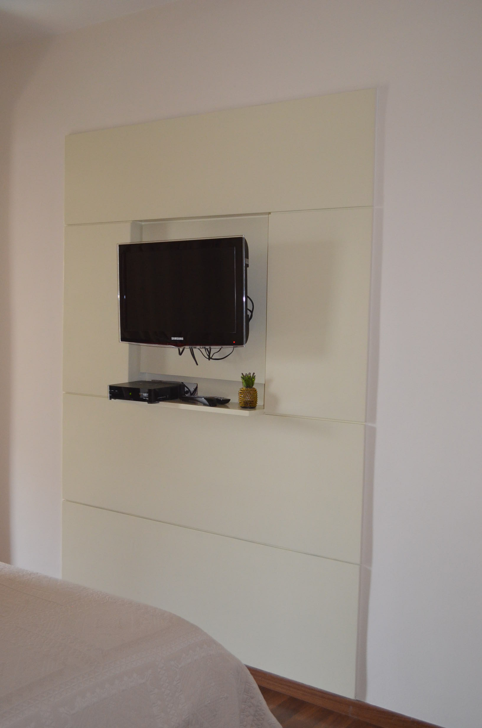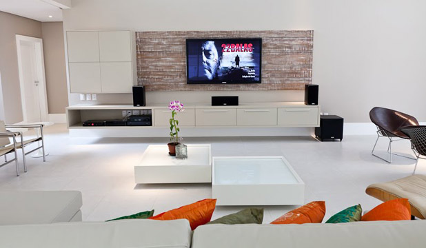 Aí, pode-se criar um painel de madeira, MDF ou gesso acartonado, com um espaço de aproximadamente 5 a 7 cm da parede (para conseguir passar as tomadas), de forma a passar toda a fiação necessária que interliga os aparelhos.