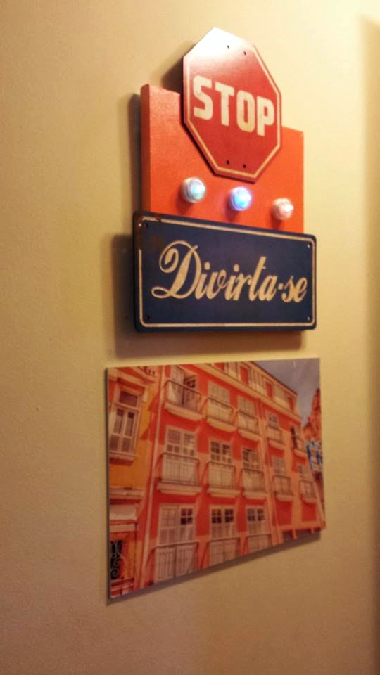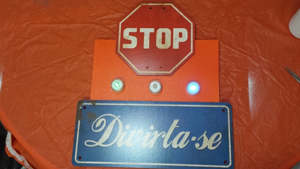 A placa “stop” foi colado na parte de cima, deixando a metade superior acima da tela. As luzes foram coladas separadamente, e elas acendem quando giramos cada uma, individualmente.