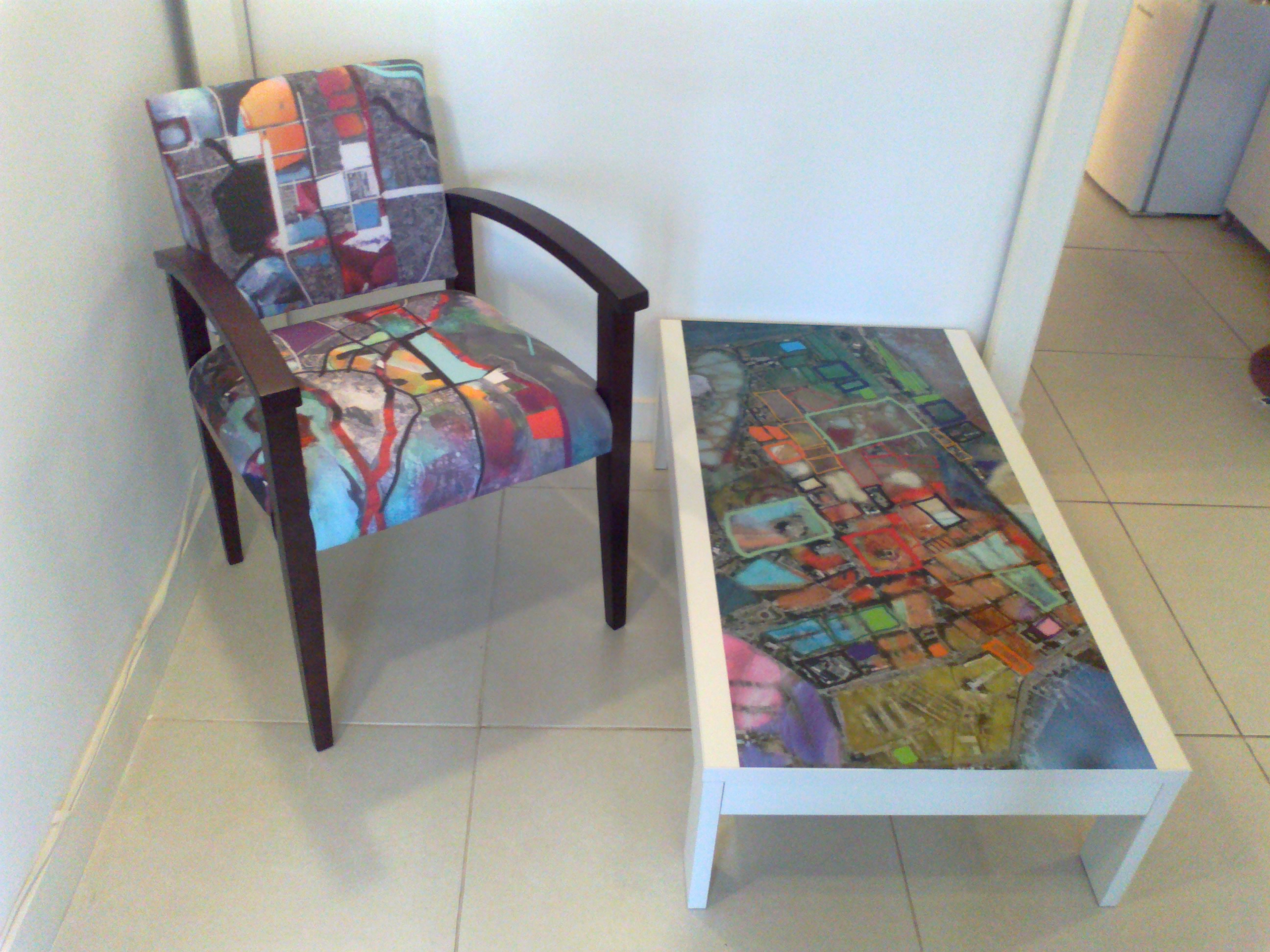 ESSES MÓVEIS SÃO DA TOKSTOK. EM PARCERIA COM A ARTISTA PLÁTICA SONIA GIL, MANDAMOS IMPRIMIR O TECIDO E UM ADESIVO PARA REVESTIR A MESA COM SUAS GRAVURAS DIGITAIS. ASSIM, PERSONALIZAMOS AS PEÇAS.