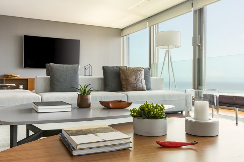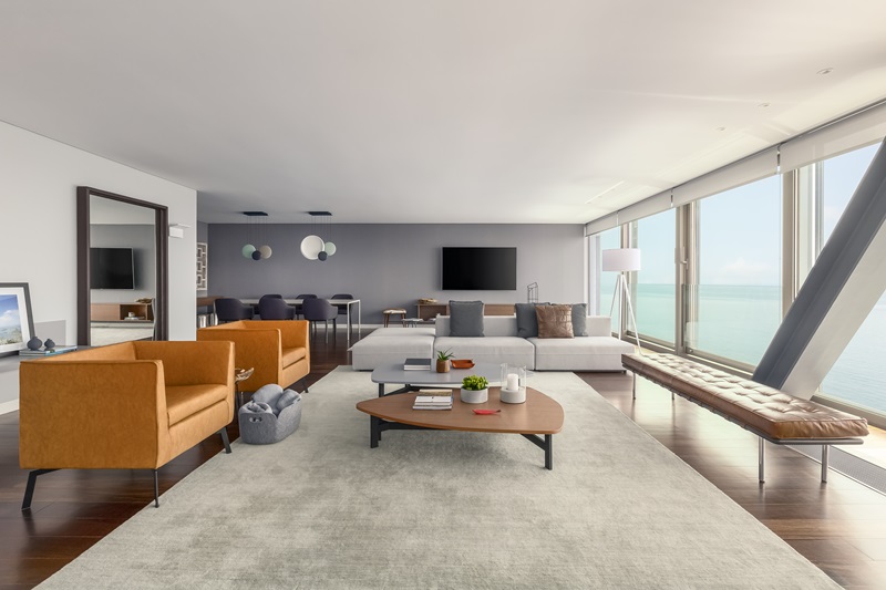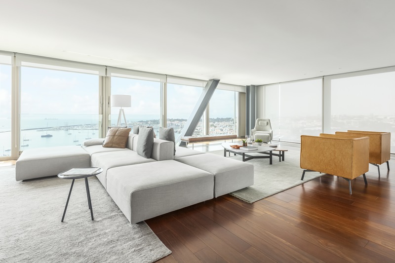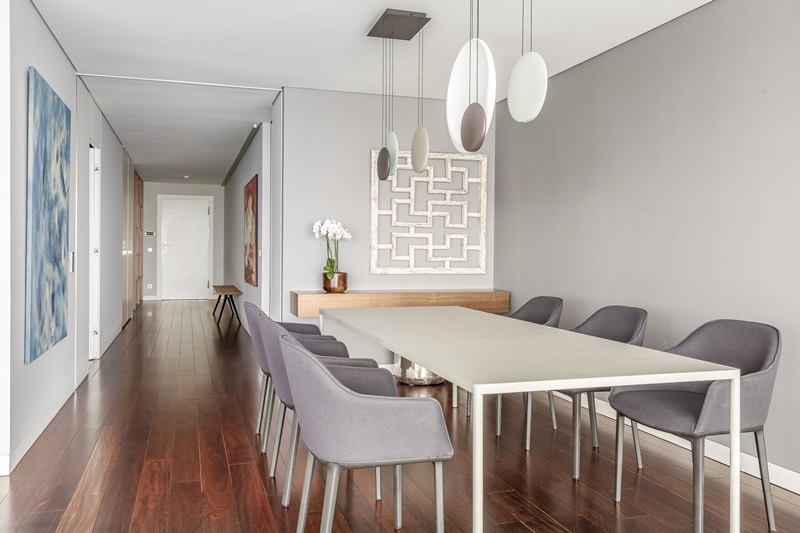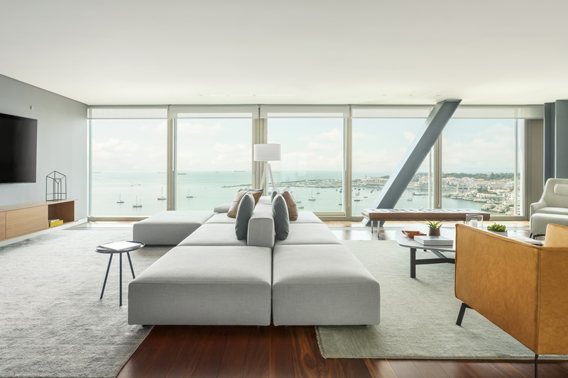 Para adequar a nova morada de 254m² ao estilo dos novos moradores, as arquitetas Gabriela Eloy e Carolina Freitas – com o auxílio de uma sócia residente em Portugal, a arquiteta Paula Engel – executaram o projeto de decoração em cinco meses, resultando em um projeto prático e de fácil manutenção, com estilo clean e sofisticado, atendendo a todas as necessidades da família. “O único pedido dos proprietários em relação ao projeto foi o uso de cores neutras, valorizando a vista de perder o fôlego que entra pelas grandes janelas do apartamento”, explica Carolina.