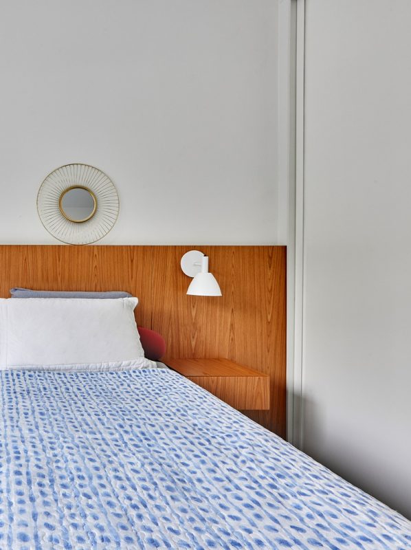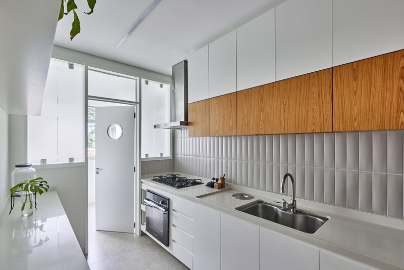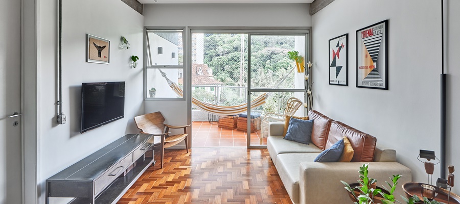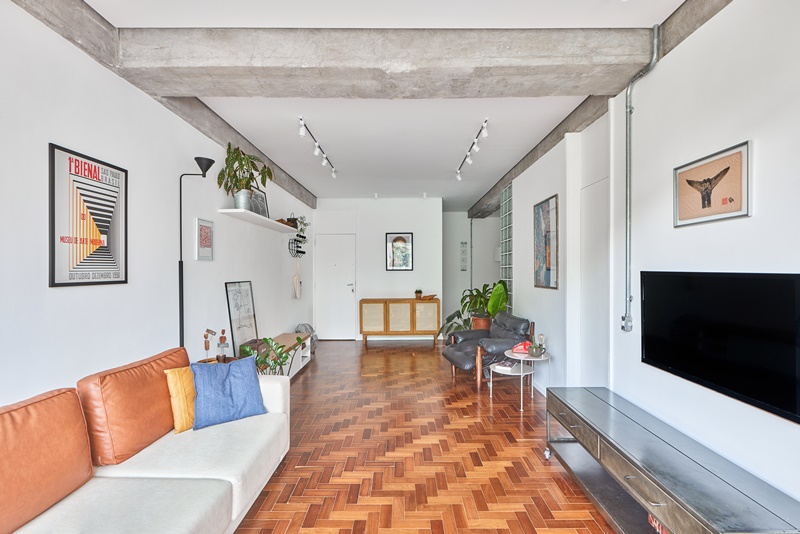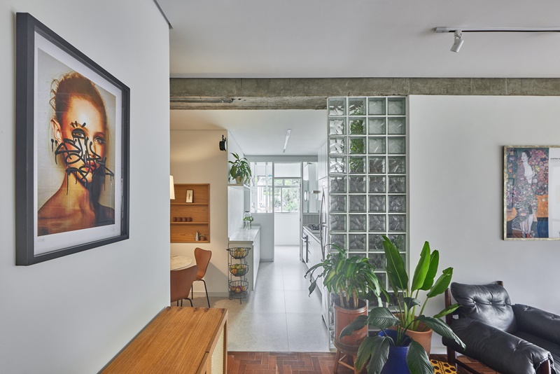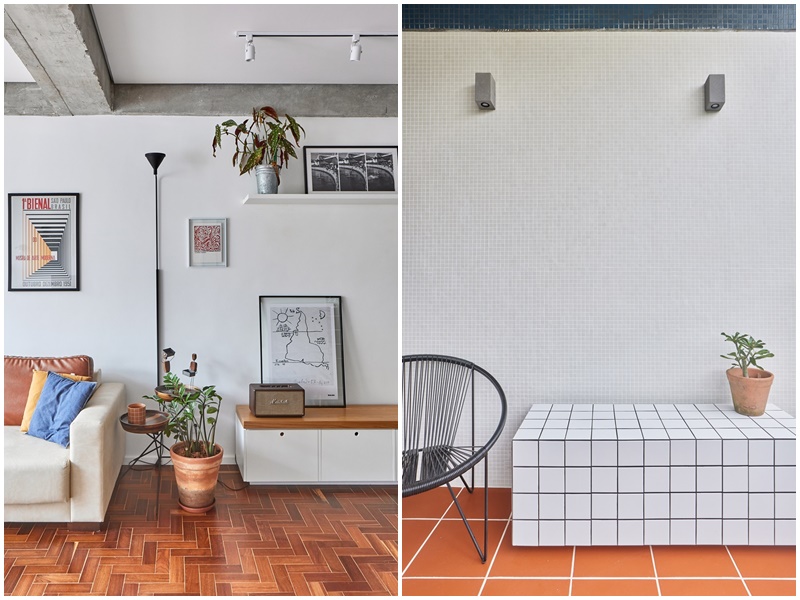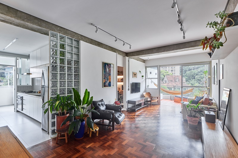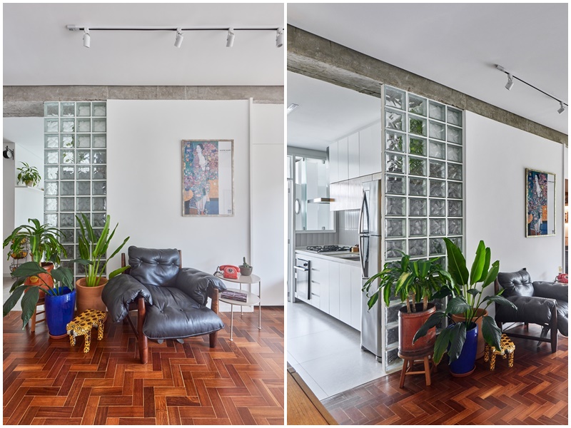 No quesito “materiais”, o arquiteto evitou acabamentos em cores fortes para transmitir calma, conforto e sensação acolhimento e, por vezes, resgatar a memória afetiva, a exemplo do tijolo de vidro que esconde a lateral da geladeira, o piso cerâmico da varanda (que lembra antigas lajotas de tijolo) e o encosto do sofá, estofado em couro caramelo. Original do apartamento, o piso em taco foi mantido e restaurado, enquanto as paredes foram pintadas de branco, quase como um framework para infinitas possibilidades.