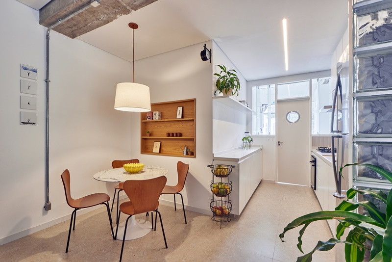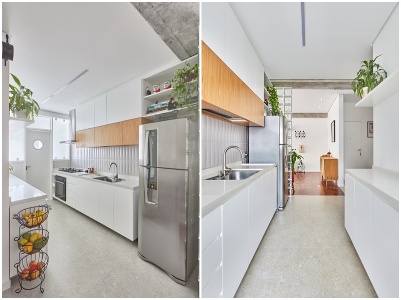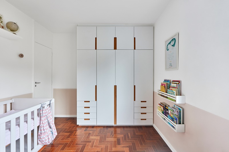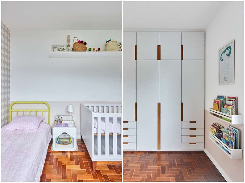 Entre as principais modificações na planta do imóvel, o arquiteto conta que eliminou a parede que separava a sala da cozinha para criar um ambiente de jantar no espaço da antiga copa, deixando os três espaços integrados. “Essa alteração aumentou consideravelmente entrada de luz natural, tanto na cozinha quanto na parte mais escura da sala”, diz. Além disso, o forro do teto da área social foi removido para aumentar a altura do pé-direito, deixando as vigas aparentes, em concreto bruto, e a parede da suíte voltada para a circulação foi derrubada para transformar o antigo closet do casal em escritório. “Mantivemos o quarto de serviço porque às vezes precisamos que a babá durma no apartamento”, informa.