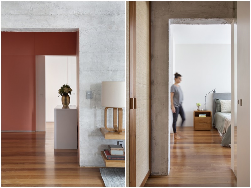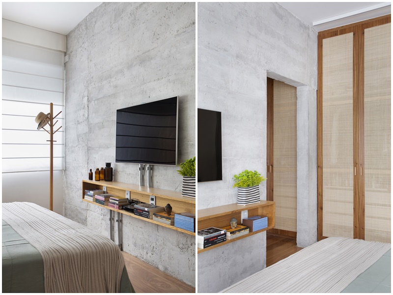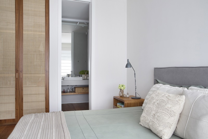 . Para quebrar a brutalidade das paredes de concreto, as arquitetas optaram por piso em réguas de ipê. Com a mesma ideia de “aquecer” e quebrar a frieza e brutalidade do concreto, no quarto da moradora, os armários foram executados também em madeira, com portas tramadas com uma delicada palhinha natural, de trama mais fechada.