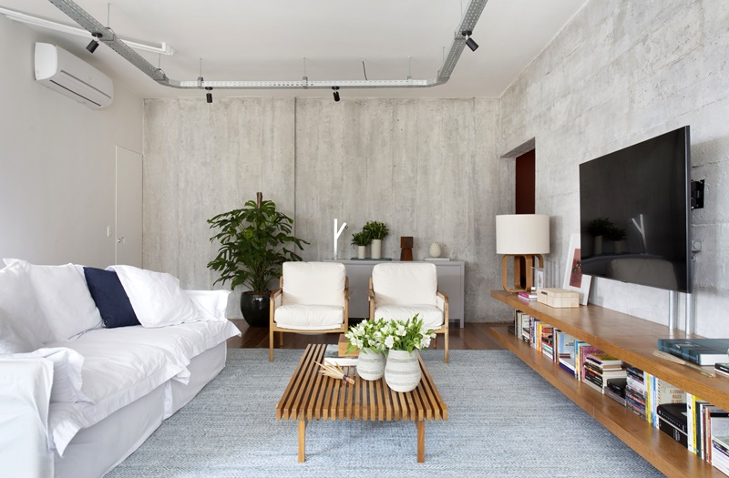 · Sobre a paleta de cores e o mix de materiais da área social: Com a ideia de assumir as paredes de concreto existentes no imóvel, as arquitetas aplicaram no piso réguas de ipê, que ajudaram a “aquecer” o ambiente, deixando-o mais acolhedor. Todo o restante da decoração possui base neutra.