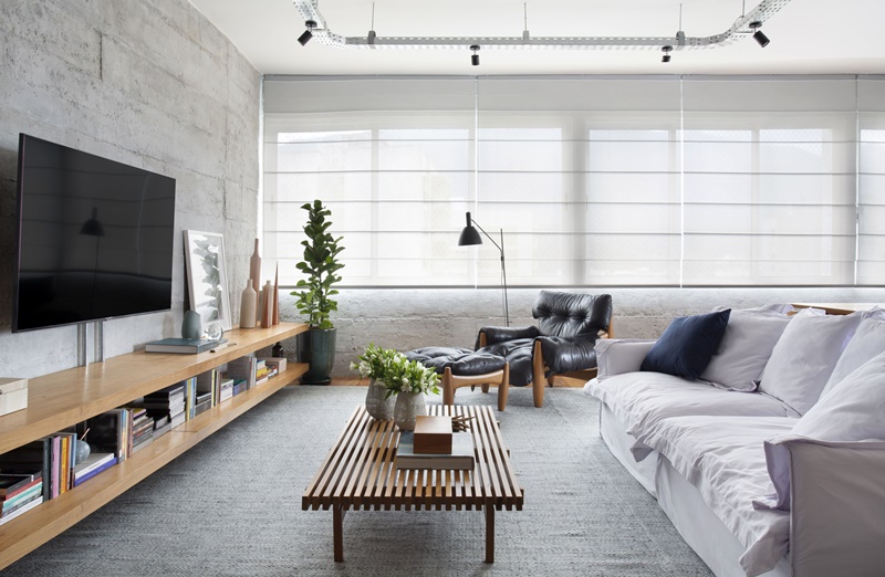 O principal conceito deste projeto das arquitetas Roberta Moura e Paula Faria foi a integração total dos ambientes, com pé-direito alto e alguns elementos de obra aparentes, como tubulações, instalações elétricas e concreto bruto.