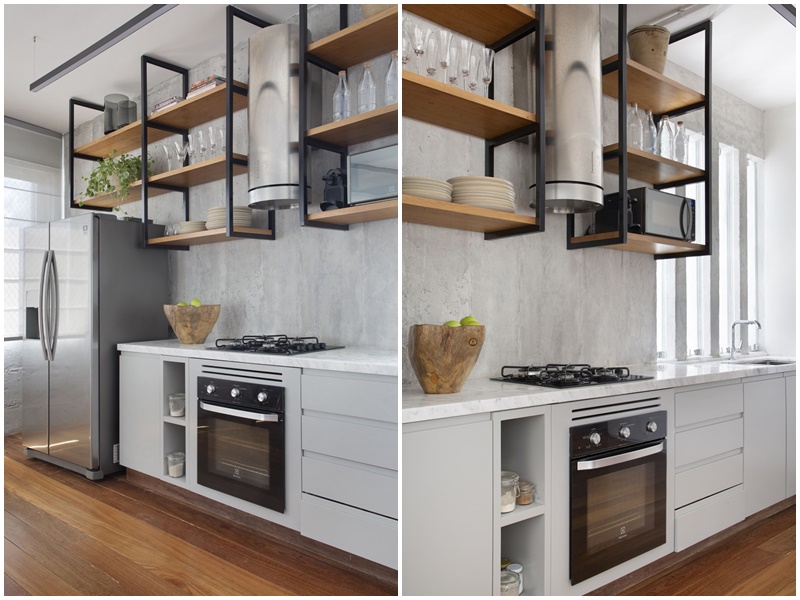 . No lugar de armários superiores fechados, a cozinha integrada à área social ganhou prateleiras de madeira apoiadas em estruturas de metalon preto, deixando à mostra itens que normalmente ficariam escondidos, como pratos, copos, travessas etc. “A cozinha é um super destaque no projeto. Desenhamos uma marcenaria especial leve em sua parte inferior, com acabamento em laca cinza, com bancada de Carrara e prateleiras superiores de ferro e madeira. Já a mesa de jantar também serve de apoio na cozinha, como se fosse uma ilha”, explica a arquiteta Roberta Moura.