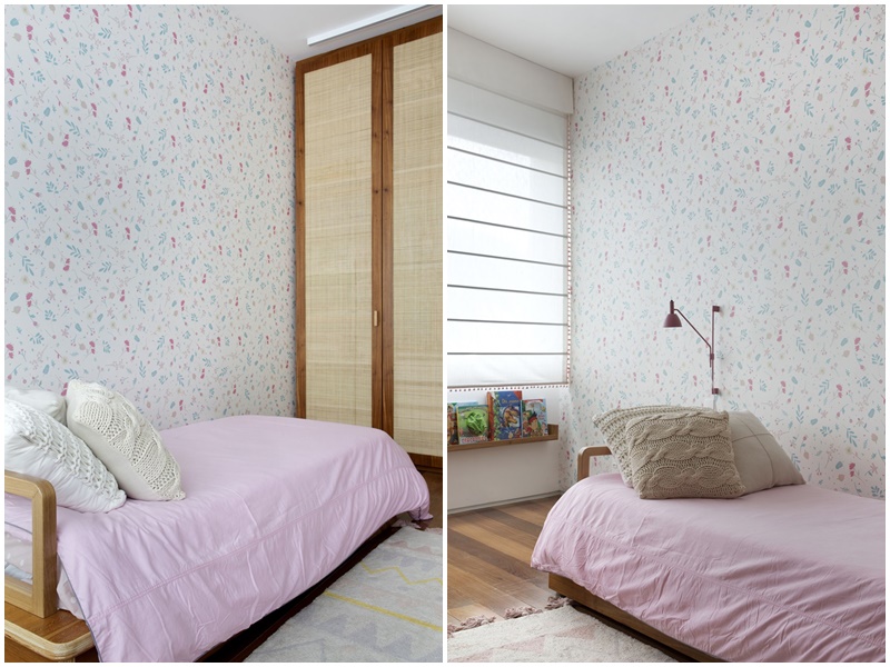 A principal modificação ocorreu na planta da cozinha, que foi totalmente integrada ao estar e jantar, sem qualquer tipo de divisão entre esses ambientes. Foi mantido um pequeno espaço fechado para área de serviço e dependência de empregada. As arquitetas criaram também uma suíte para a proprietária, além de dois quartos para os filhos com um banheiro.