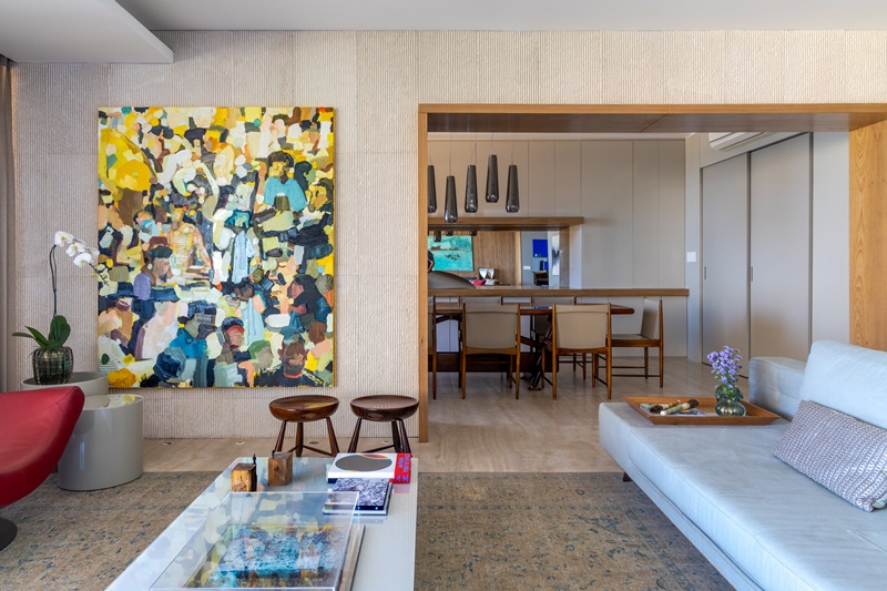 As cores dos estofados são suaves para que os quadros e os objetos sejam o foco da decoração, exceção feita para as poltronas vermelhas, design clássico de Ricardo Fasanello. Os móveis de design brasileiro foram uma escolha acertada para o apartamento que tem também peças de Zalszupin e Sergio Rodrigues.