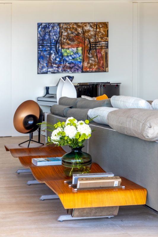 A primeira providência foi trocar as esquadrias da varanda, que tinham vidro fixo, para poder abrir toda a sala a aproveitar melhor a vista. O living tem dois ambientes, um deles revestido de madeira onde foi instalado um telão sendo que em uma das laterais, a parede é da mesma madeira. Foi esse o recurso da arquiteta para escamotear uma das portas do apartamento. “Quando ela está aberta, pode-se ver o mar do corredor”, explica Andrea. “Eu não acho bonito uma sala cheia de portas e sempre procuro disfarçá-las. Procuro valorizar o mais que posso as obras de arte e não detalhes de arquitetura”, complementa.