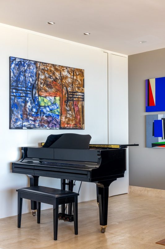 Outra astúcia de Andrea foi mudar a porta de entrada de lugar para a mesma parede em que fica o lavabo, ambas bem disfarçadas e ainda na companhia de um lindo piano de cauda. No lugar da antiga porta uma parede a mais para abrigar as inúmeras obras de arte dos moradores. No quarto principal impera a simplicidade, sendo o espelho novamente um recurso para trazer a paisagem para dentro. A cabeceira da cama é original: feita de tijolinhos de concreto de tons e texturas diferentes. O piso de travertino lembra a areia do mar prolongado na varanda decorada com poucas e práticas peças para aguentar o sol e o mar.