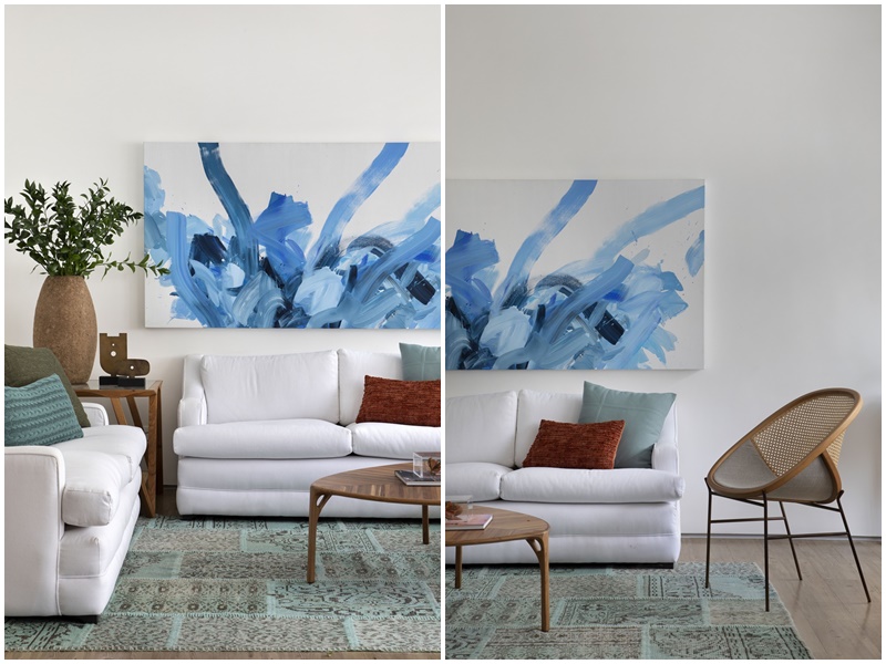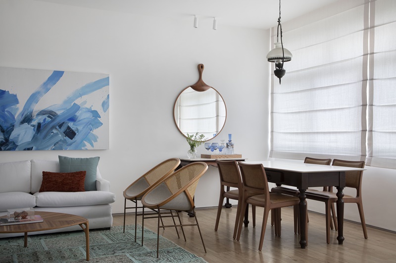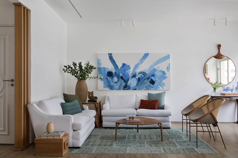 Para fazer contraponto às peças “antiguinhas” que a cliente fez questão de manter no novo lar, o escritório usou um quadro grande (azul com fundo branco) do artista plástico René Machado em destaque na parede do sofá. O toque de contemporaneidade também se faz presente através de móveis brasileiros de design assinado, como as poltronas Isa e a luminária Gramp (Jader Almeida), as cadeiras Eclipse (Lattoog), a mesa de centro Zaha (Aristeu Pires), e o espelho de parede Chuva (Leo Romano).