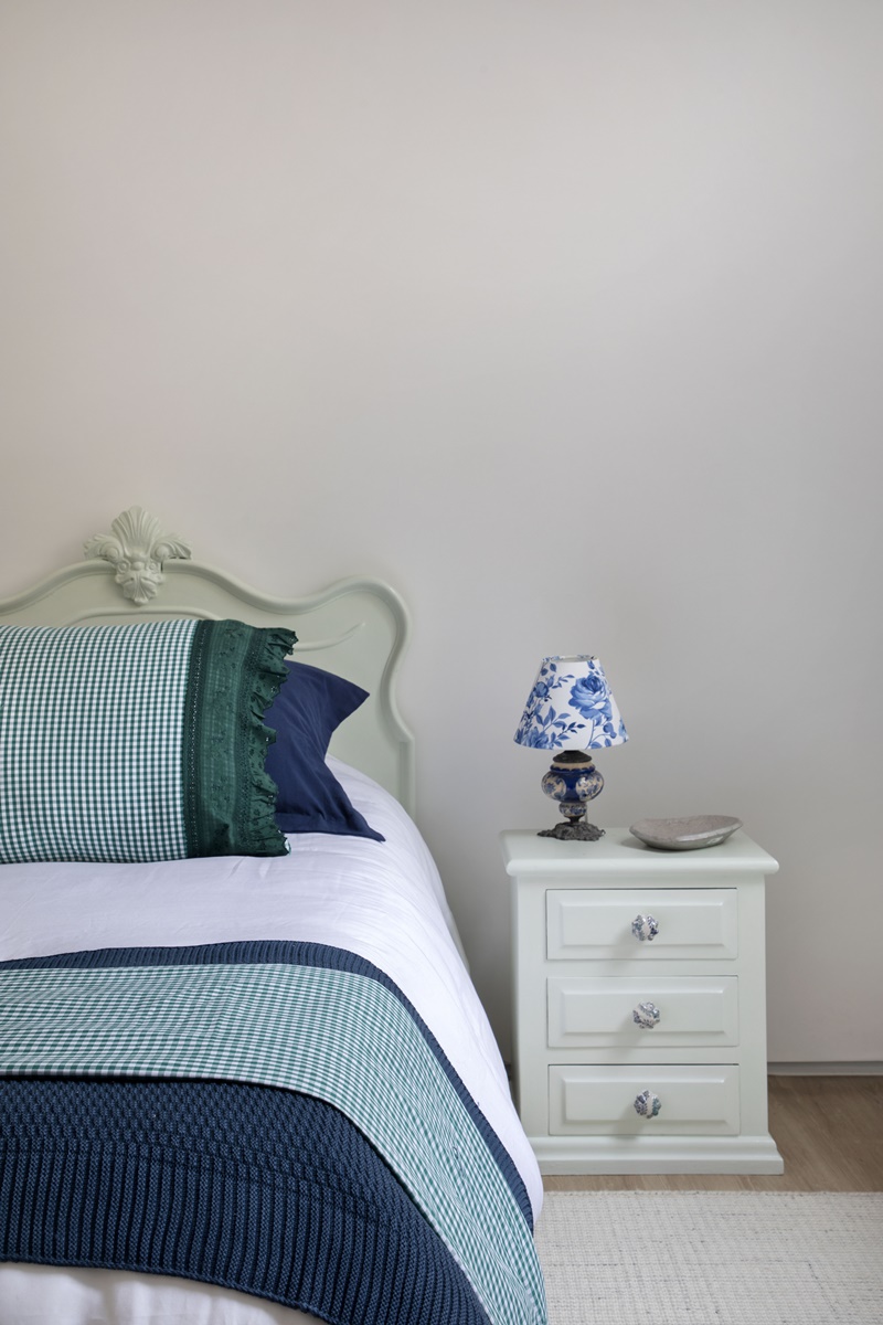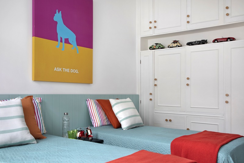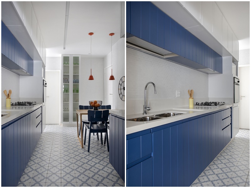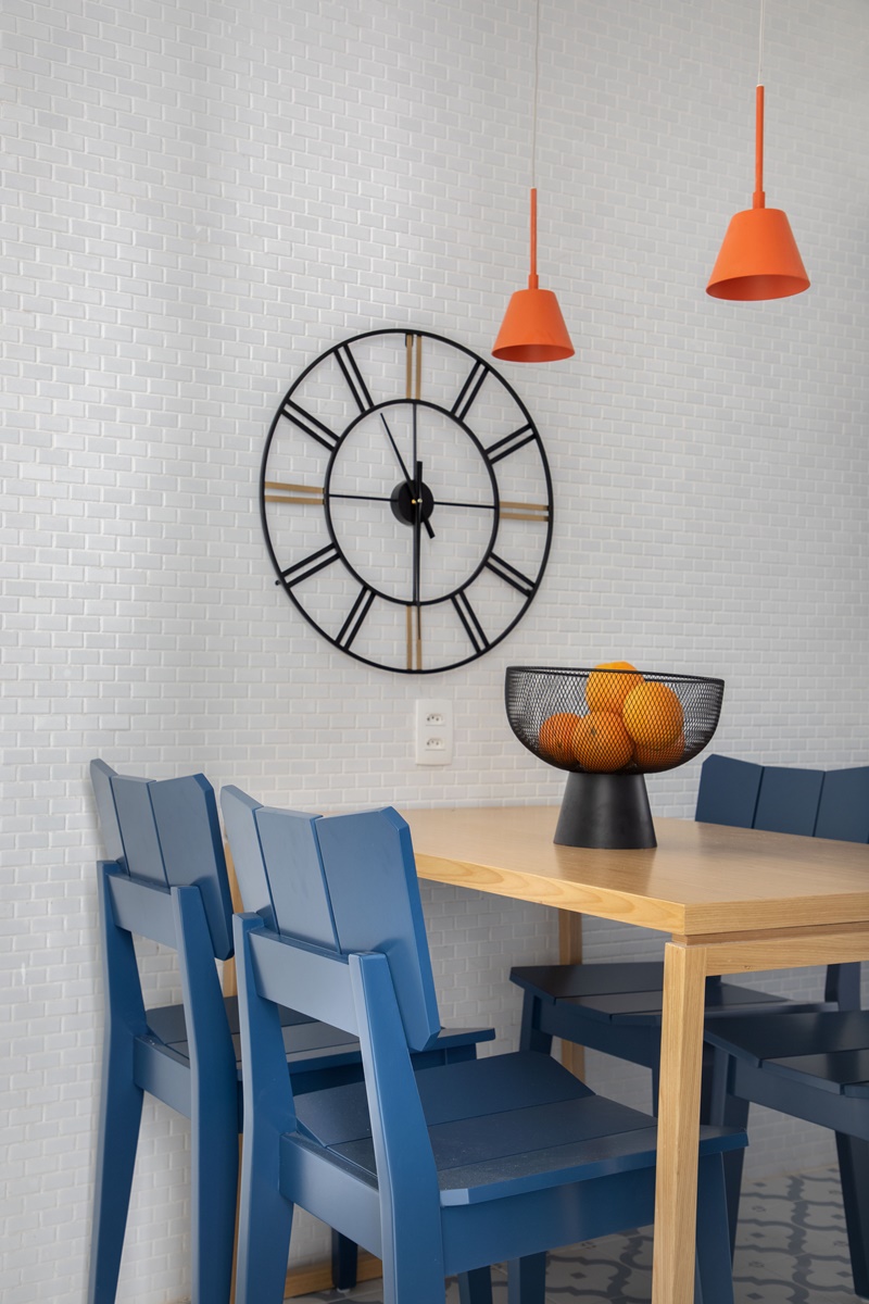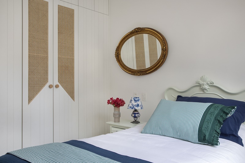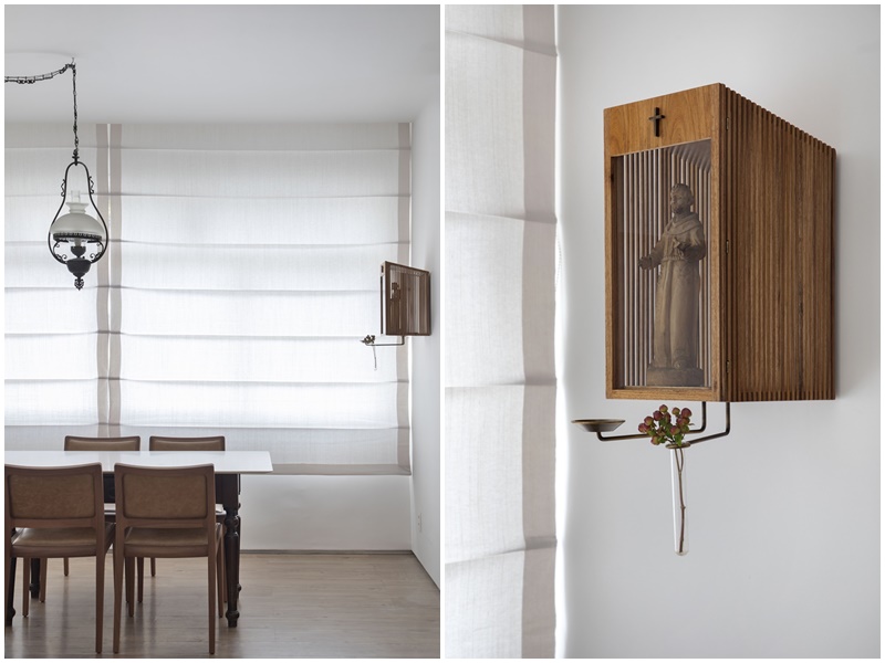 O projeto buscou inserir peças retrô de valor afetivo que a cliente já tinha – algumas compradas ao longo da vida, em momentos especiais; outras herdadas de pessoas muito queridas – em espaços contemporâneos. Do apartamento anterior, vieram, por exemplo, o espelho oval do quarto (com moldura clássica dourada) que pertencia ao bisavô da cliente, a cama dela, a tapeçaria na parede da sala, a base da mesa de jantar e o aparador, os dois sofás (que foram reestofados), a luminária pendente da mesa de jantar, a mesa de estudo e a cadeira no quarto dos netos. A ideia de revistar o estilo retrô fica ainda mais evidente na cozinha, que ganhou piso de cerâmica estampada em azul e branco (modelo Vodevil Ladahki, da Colormix), backsplash em mini cerâmicas brancas (metro style), armários inferiores com portas ripadas azul vibrante e superiores com portas almofadadas brancas. “Como a cliente é super católica e possui muitas esculturas de santos, ela queria ter um espaço de oração em casa. A escolha do oratório assinado pelo Dado Castello Brasil atendeu ao desejo dela, com um toque de contemporaneidade“, conta Victória.