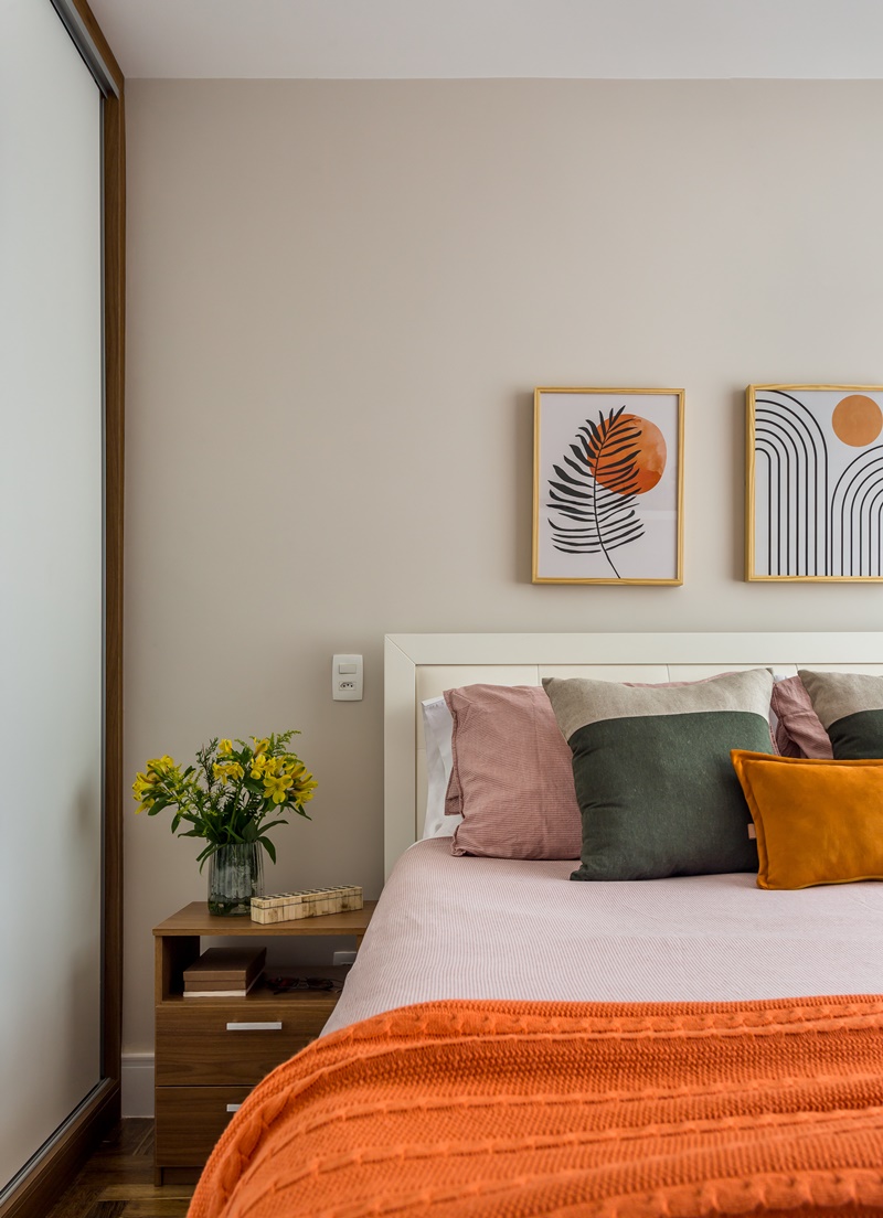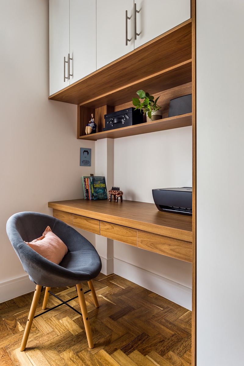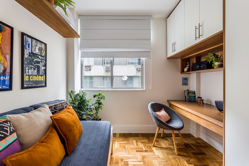 Segundo as arquitetas, a planta sofreu poucas intervenções durante reforma e os três quartos foram mantidos. Apenas porta do escritório foi trocada de lugar para dar espaço a uma suíte no quarto principal, pois originalmente o apartamento tinha dois banheiros sociais. “As demais alterações foram, basicamente, de revestimento, pintura, marcenaria e decoração“, conta Juliana.