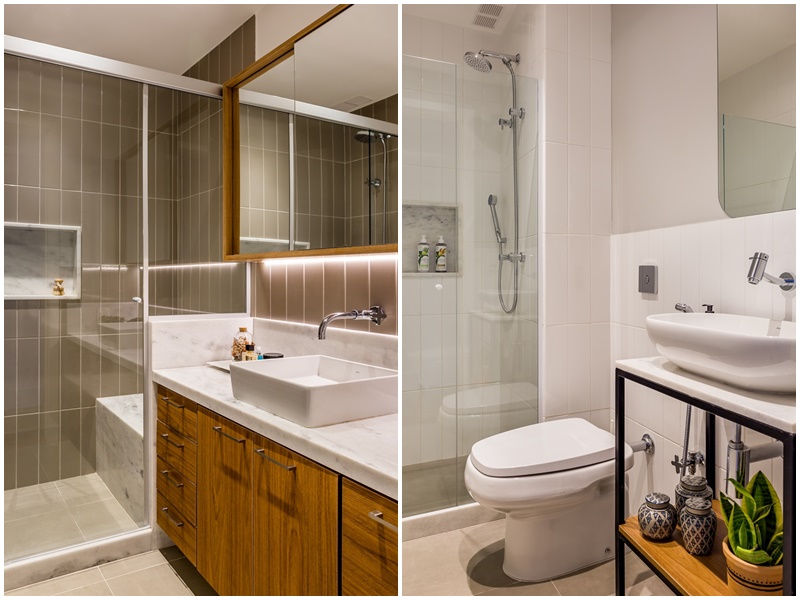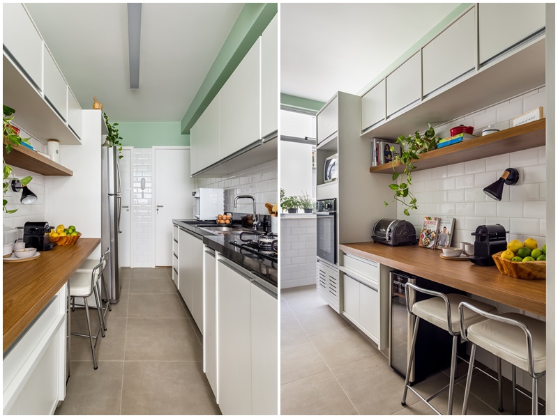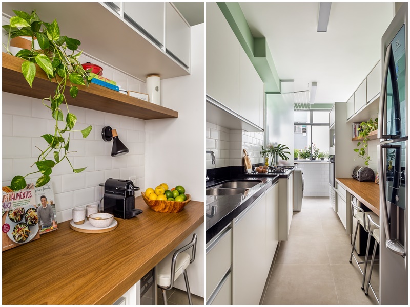 Entre os destaques da sala, vale citar a pintura da parede até 2/3 de altura do pé-direito para dar uma sensação de estante junto ao rack existente e a prateleira em cima do sofá, que serve de apoio para quadros e adornos. Na cozinha, chama a atenção o azulejo branco metro style até a altura da porta, com pintura verde na parte superior. No escritório, rouba a cena a marcenaria desenhada pelas arquitetas, com múltiplas funções: escritório, armazenamento para hóspedes e rouparia da casa. Já no banheiro da suíte, se destacam o banco dentro do box, que trouxe um conforto extra na hora do banho, e o armário superior com iluminação embutida e bastante espaço de armazenamento.