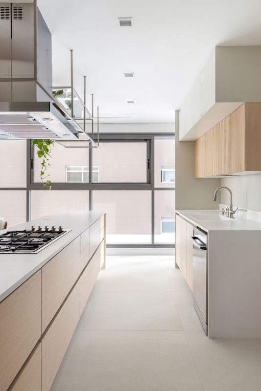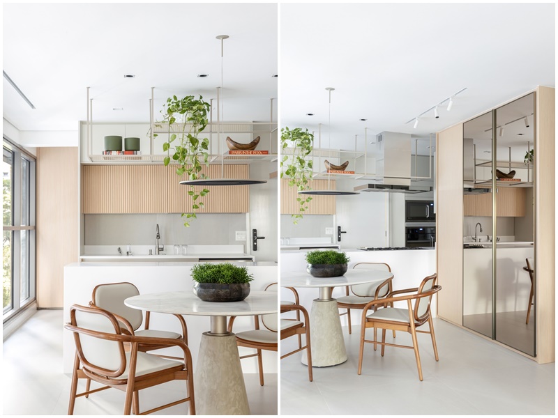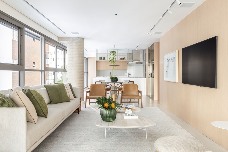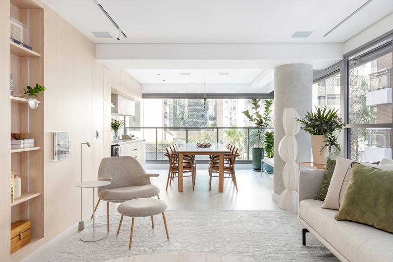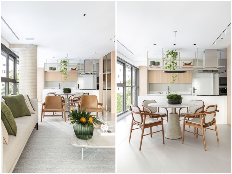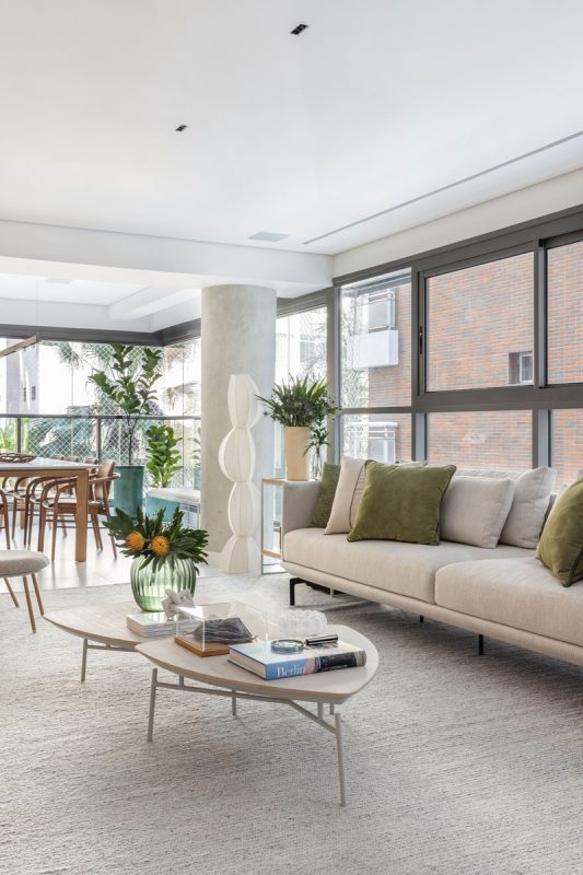 Na decoração, que segue o estilo contemporâneo atemporal, com atmosfera escandinava, é tudo novo – até os enxovais dos quartos e as louças e utensílios da cozinha foram selecionados pela arquiteta, com a ajuda de um personal organizer. A maior parte dos móveis foi adquirida na Novo Ambiente de São Paulo, priorizando o “combo” leveza visual, conforto, praticidade e atemporalidade em cada peça. “De início, a cliente pediu uma paleta de cores integralmente neutra, clara e sóbria. Por isso, os tecidos de estofamentos e cortinas, o tapete e o piso da área social passeiam dos tons off white ao cinza claro, enquanto as marcenarias ganharam acabamento em madeira natural, também bem clarinha. Depois, para quebrar a monotonia cromática sem pesar visualmente, ela pediu para acrescentar toques que verde, que aparece nas plantas, vasos e almofadas”, diz Paula.