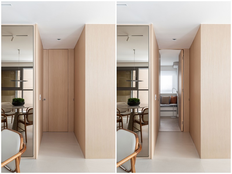 Com a reforma, o apartamento foi praticamente colocado abaixo. No novo layout desenhado pela arquiteta, a varanda gourmet e a cozinha – antes isoladas, por exemplo -, foram integradas ao living central. “Colocamos a mesa de jantar, com oito cadeiras, no espaço da varanda gourmet, já que no outro lado do living, bem em frente à bancada de cocção tipo península da cozinha, fica a mesa de almoço, com quatro cadeiras”, informa ela. “Por ser repleta de armários e ainda contar com churrasqueira e depurador camuflado na marcenaria, a bancada em corian da varanda gourmet se tornou um apoio super prático à mesa de jantar, deixando este espaço mais independente da cozinha”, acrescenta. Já os outros cômodos do apartamento foram redivididos com a ajuda de armários-divisórias e painéis de marcenaria. Até o hall do elevador, que é privativo, foi renovado, seguindo a mesma linguagem estética adotada na área social.