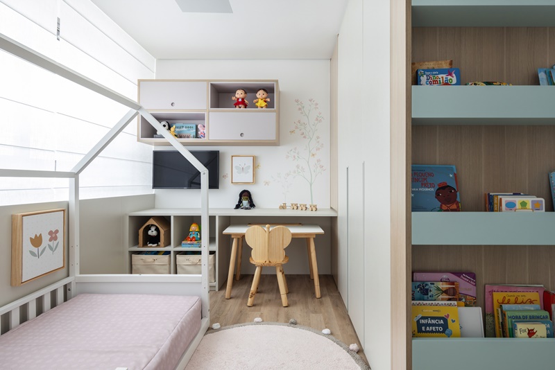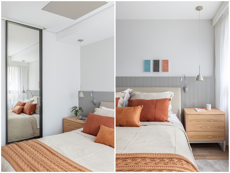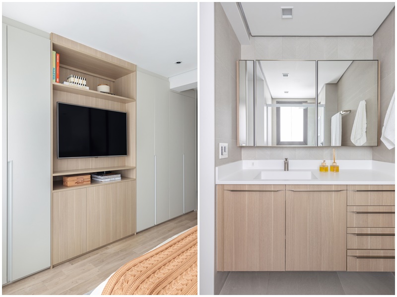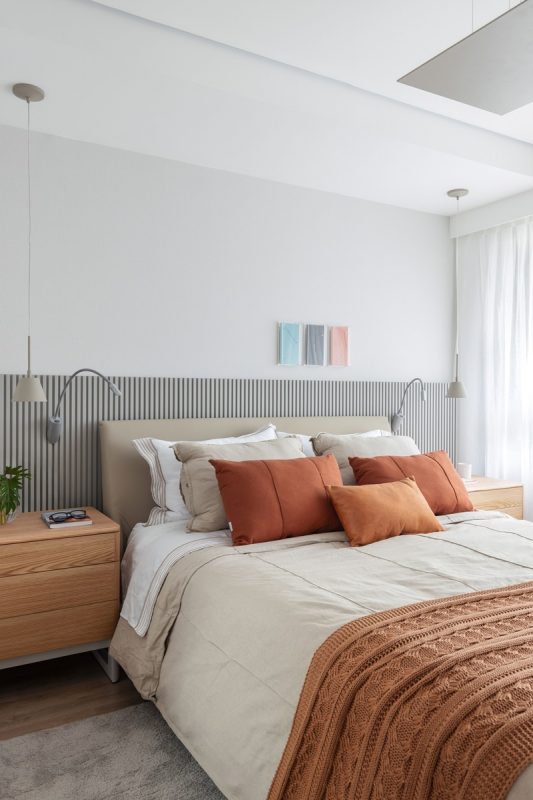 Já na área íntima, os quartos ganharam piso flutuante amadeirado e marcenarias ora com acabamento em madeira ora em laca cinza – sempre em tons claros -, com direito a papel de parede tipo linho no dormitório do casal e pintura artesanal na parede do dormitório da filha, feita pelo ateliê A Casinha.