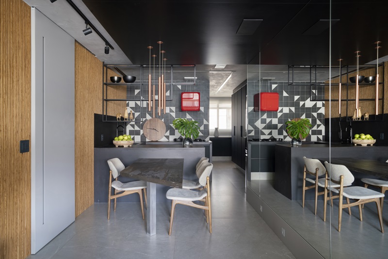 · Outro pedido do morador foi em relação às cores, também um grande desafio para a arquiteta, que a deixou bastante tensa em um primeiro momento. Por ser flamenguista, ele queria um projeto com as cores do time: vermelha e preta. O resultado, sem cair no clichê, surpreendeu a própria arquiteta.