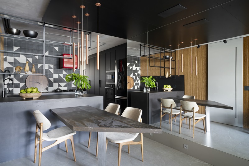 . A cozinha foi totalmente integrada à sala, trazendo vários benefícios ao morador – além de aumentar a sensação de amplitude no apartamento, tornando-o mais funcional, deu mais privacidade à área íntima da residência, já que na planta anterior era necessário acessar a circulação dos quartos para ir da sala à cozinha.