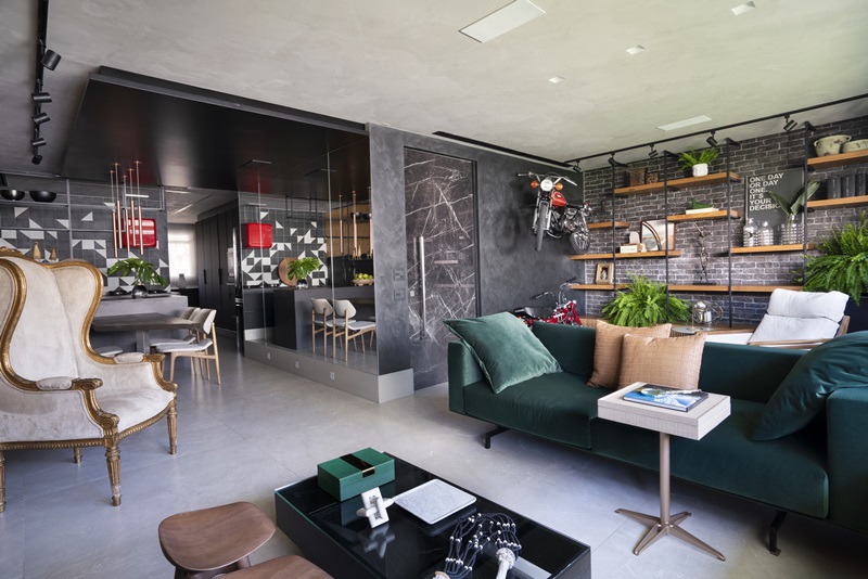 Decorar em tons rubro-negro e expor duas motocicletas antigas na sala de estar foram alguns dos desafios da arquiteta Paula Costa ao projetar esse apartamento de 110m2, no Leblon,para um homem de 55 anos, separado e que mora sozinho