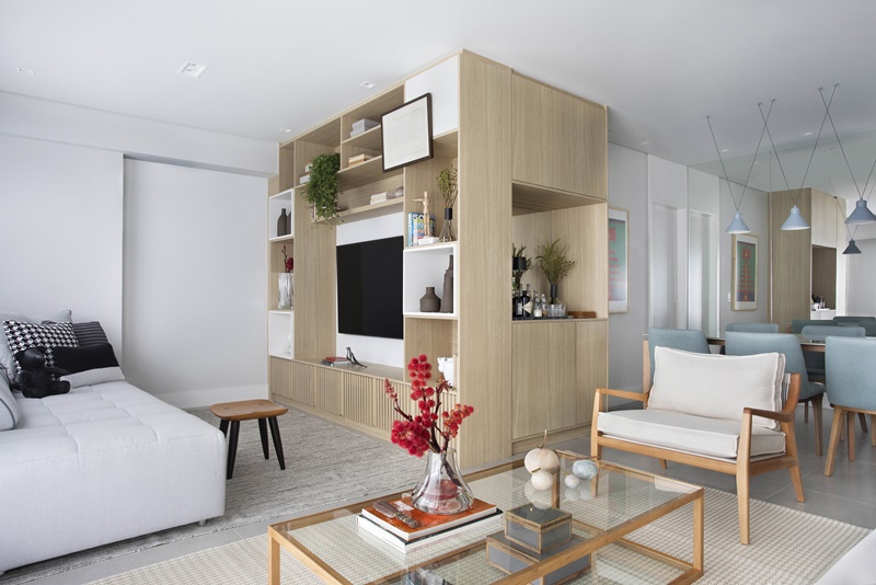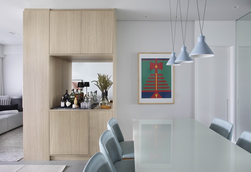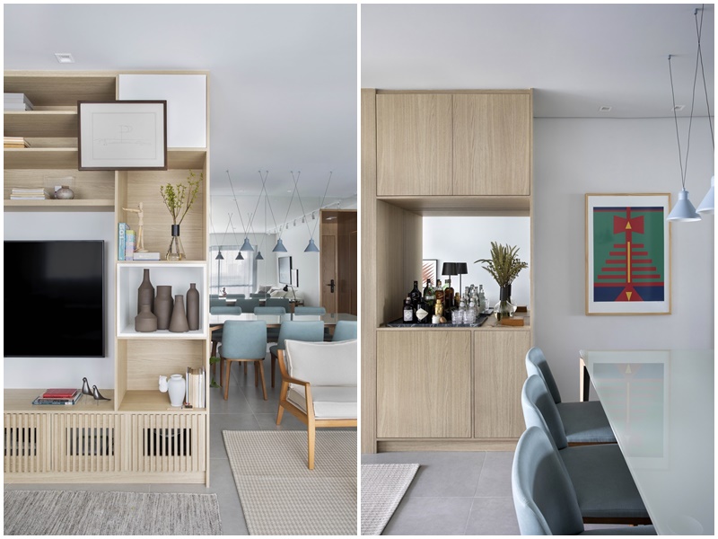 Logo no primeiro encontro, os clientes pediram aos arquitetos que a sala fosse ampliada. Na decoração, eles queriam uma base neutra e uma atmosfera leve e clara que valorizasse as obras de arte que eles já possuíam. “Para a ampliação da sala, demolimos a parede do quarto vizinho e integramos tudo”, conta Bernardo. “Revestimos todo o hall de entrada com painéis de madeira clara, inclusive o teto, e repetimos o material na estante em L, que abraça a quina da parede, atendendo tanto a sala com tv como a sala de jantar. No lado do jantar, criamos um nicho com fundo espelhado que funciona como bar, com armários em cima e embaixo que servem de louceiro”, acrescenta Tânia. A madeira também está presente nos móveis de design assinado, sendo a maioria deles adquiridos no @ArquivoContemporaneoOficial.