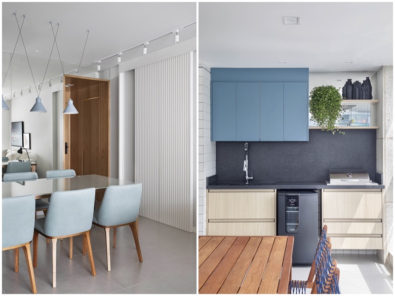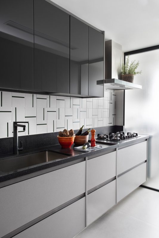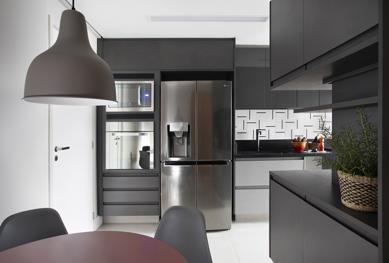 Já a cozinha passeia por tons de preto, cinza, grafite e branco, com destaque para o backsplash de azulejos com estampa geométrica minimalista e os eletros com acabamento em aço inox.