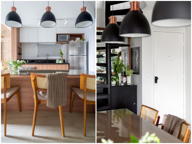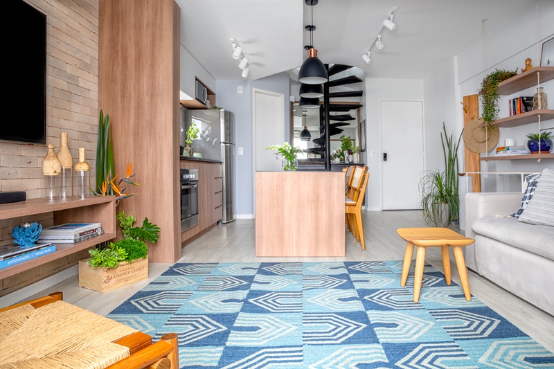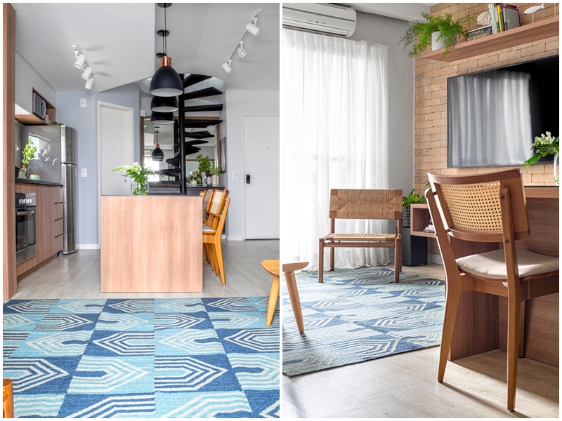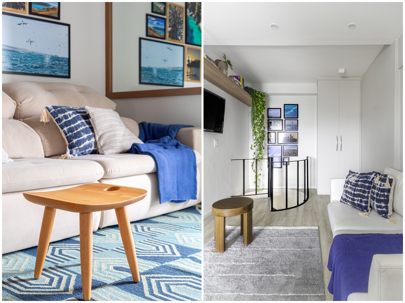 Originalmente, a sala era compartimentada, com uma grande estante escura que dividia o espaço, além de uma bancada alta na cozinha. A reforma não só contemplou todos os cômodos como também promoveu a total integração entre a sala de estar, de jantar e a cozinha. Já a decoração, de estilo contemporâneo com toques praianos, é uma mistura equilibrada de elementos modernos e rústicos, com destaque para o tapete da sala com estampa geométrica em duas tonalidades de azul, o mancebo de madeira e concreto posicionado no hall de entrada e os quadros de fotografias de praia feitas pelo próprio cliente, que ganharam composições tanto na parede atrás do sofá da sala como na parede da escada que dá acesso ao quarto do cliente. “Nosso maior desafio neste projeto foi trazer leveza ao apartamento, sem alterar alguns itens existentes que eram bem escuros e marcantes e não poderiam ser mexidos, como a escada e a bancada da cozinha“, avalia Kênia. “Conseguimos fazer a casa de um surfista em plena selva de pedra usando elementos náuticos que o cliente preserva em sua memória afetiva“, finaliza Giulia.