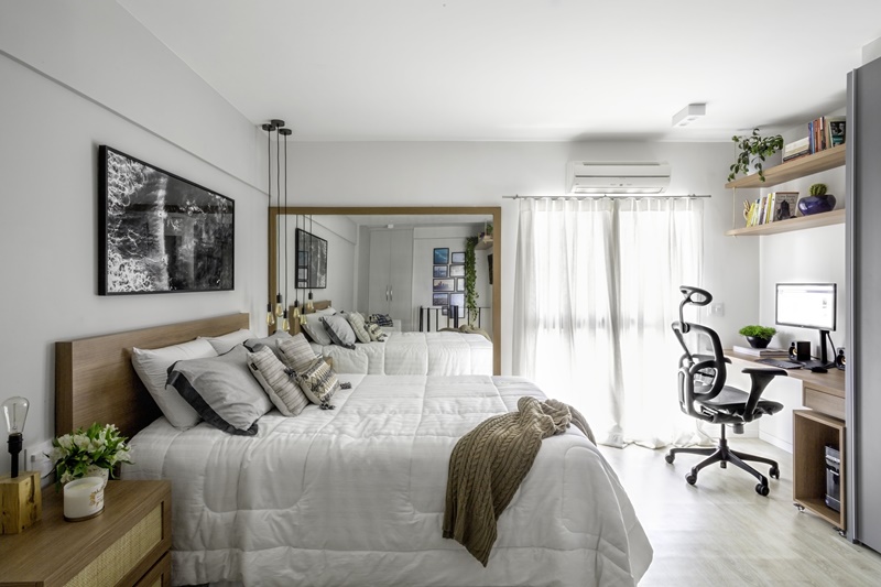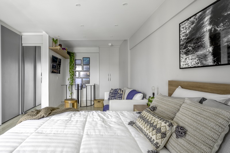 Bruno, que é tradutor e tem 35 anos, já morava neste apartamento duplex com 70m2, localizado em Moema (São Paulo), quando decidiu pedir ajuda às arquitetas Kênia Zabka e Giulia Closs, do escritório Zabka Closs Arquitetura (@zabkacloss), para imprimir um pouco de sua personalidade em cada cantinho do imóvel. Durante um tempo, como ele viajava muito a trabalho, quase não parava em casa. Com a mudança na rotina, o lar finalmente ganhou a devida importância. “Ele queria lembrar um pouco da praia, mesmo estando em casa, em São Paulo. E também que os ambientes fossem integrados para aumentar a sensação de amplitude, já que o apartamento é pequeno“, conta Kênia.