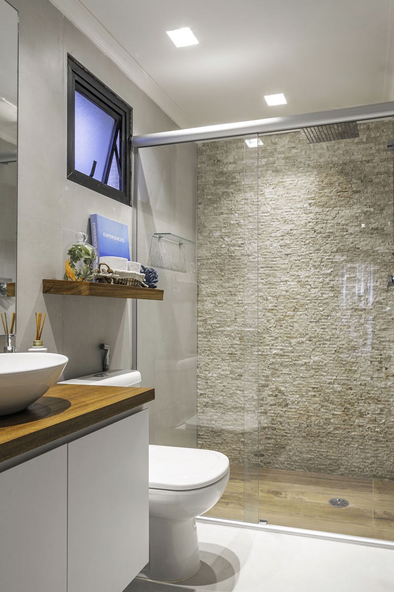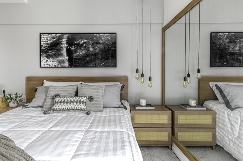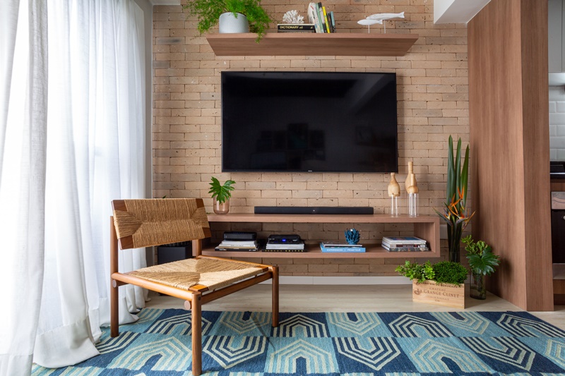 A escolha dos materiais foi fundamental para imprimir no projeto a atmosfera praiana desejada, até porque o budget do cliente era limitado. “Usamos bastante madeira e apostamos em materiais mais rústicos, como o tijolinho que reveste a parede da sala, e a canjiquinha de pedra natural, presente nos banheiros. Já a corda de fibra natural e a palhinha aparecem de maneira mais sutil no encosto das cadeiras, na poltrona e na marcenaria do quarto“, explica Giulia. “A paleta de cores também trouxe, de alguma forma, as cores da praia. Optamos por tons de bege, cinza e azul, em referência à areia e ao mar“, acrescenta ela.