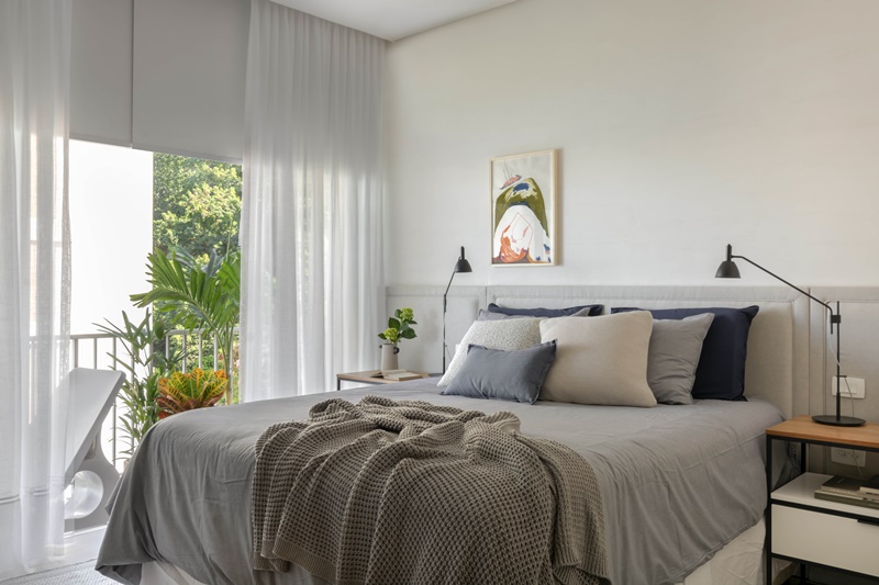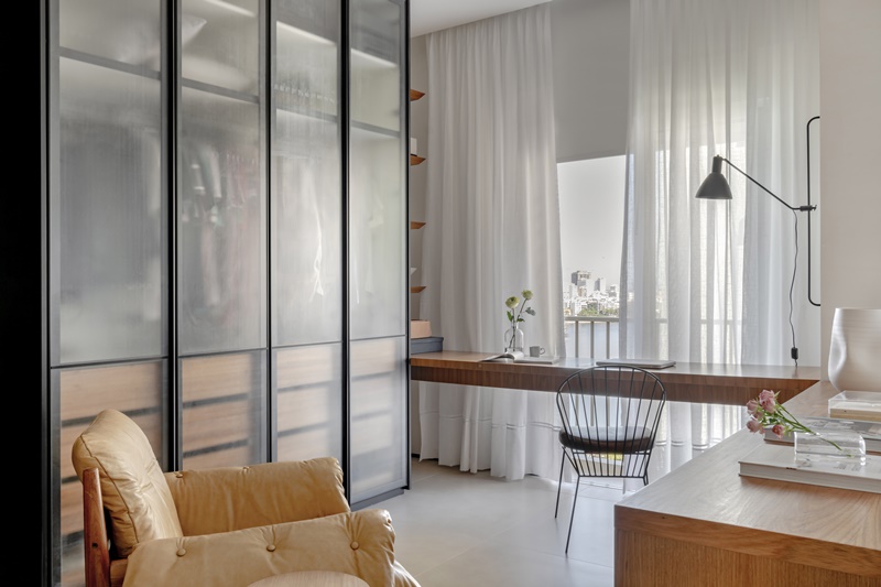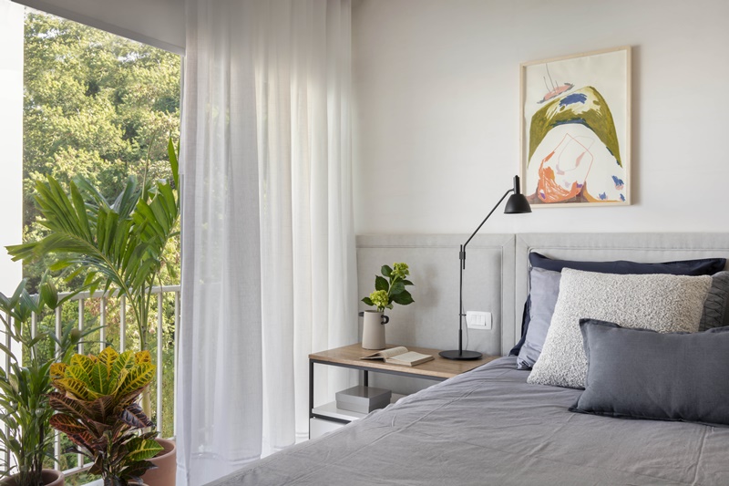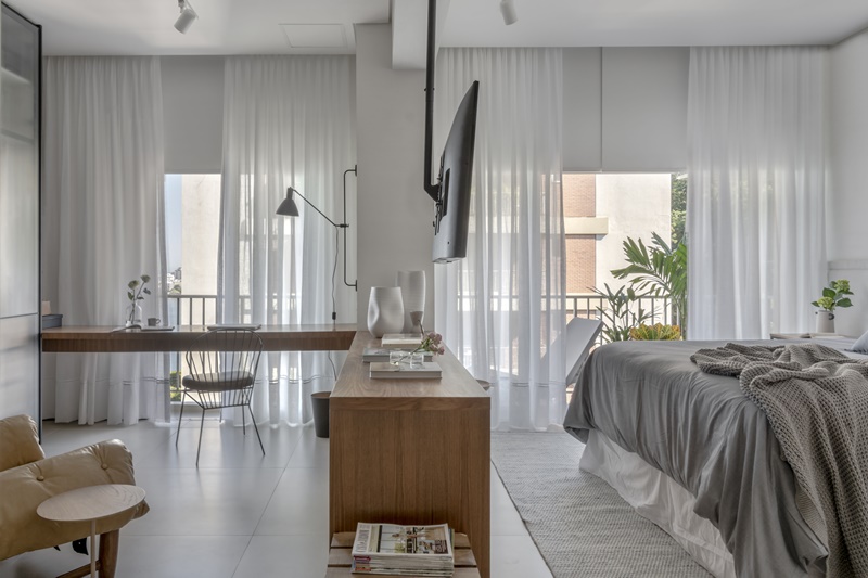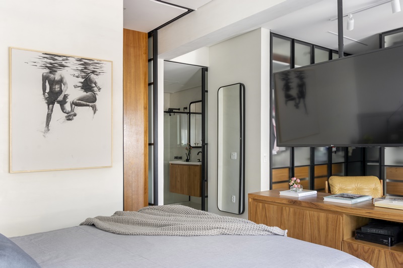 No primeiro andar, a reforma contemplou a área de refeição/copa e o quarto do casal (que virou uma suíte máster) e, no segundo andar, a sala de estar com tv, que foi totalmente repaginada e ganhou novo layout. Ficaram para a segunda etapa do projeto a cozinha e a área de serviço no piso inferior e a varanda e a suíte de hóspedes, que ficam no andar de cima. “Como os clientes já tinham uma sala de tv no segundo andar, incorporamos a sala de estar e o lavabo do andar inferior ao quarto do casal para criar uma super suíte, abrindo espaço para um banheiro bem maior, além de closet e escritório integrados à área de dormir”, conta a arquiteta. “Sem dúvida, esta suíte com ares de loft é a cereja do bolo do projeto”, acrescenta.